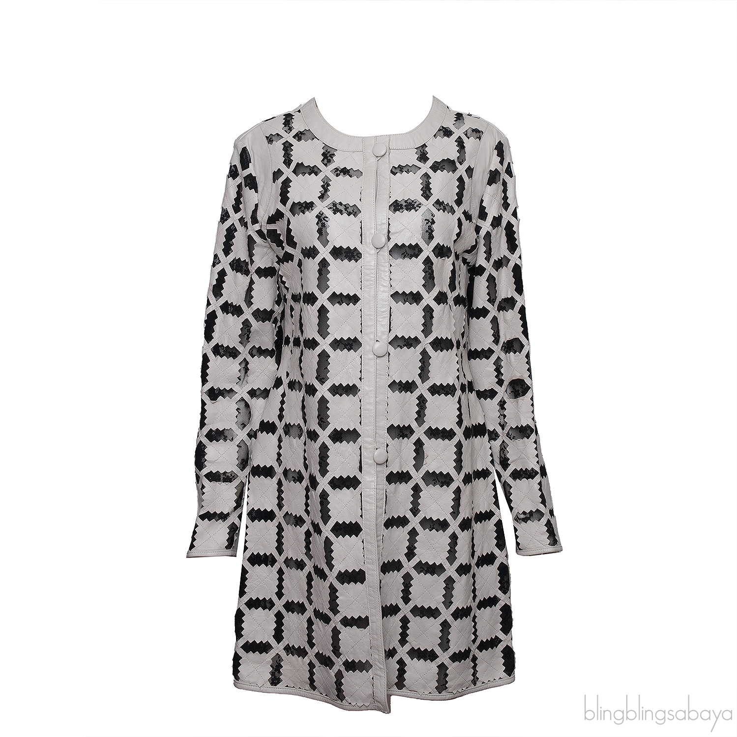 Akhesa Light Grey & Black Mesh Leather Coat This Light Grey & Black Mesh Leather Coat from Akhesa is crafted from lamb skin and black lace lining. This coat features a round neckline, button fastening through the front, black floral lace lining, long sleeves.
