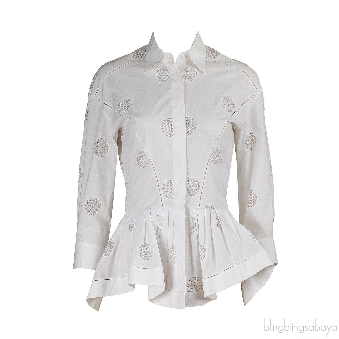 Alaia White Cotton Peplum Shirt This Alaia White Cotton Peplum Shirt is crafted from 100% Cotton in white featuring a classic pointed collar, button fastening through the front, peplum design, third quarter sleeves with button cuffs.