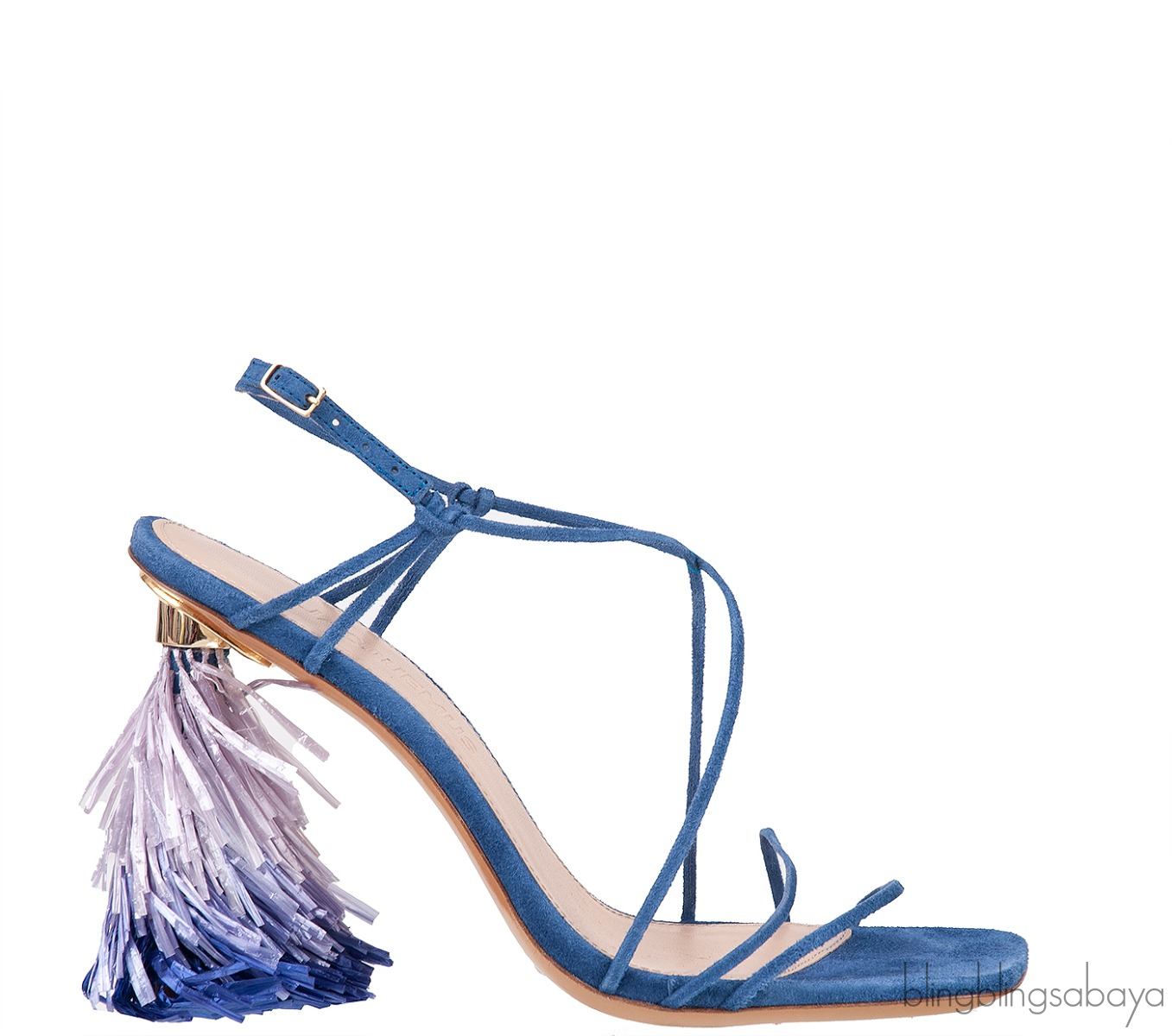 These Blue Raffia Pompom Heel Suede Sandals from Jacquemus are crafted from blue suede upper. These sandals features a string upper, square toe, leather lined insole, sling back with gold fastening, gradient blue raffia covered heels measuring 90 mm high and leather sole.