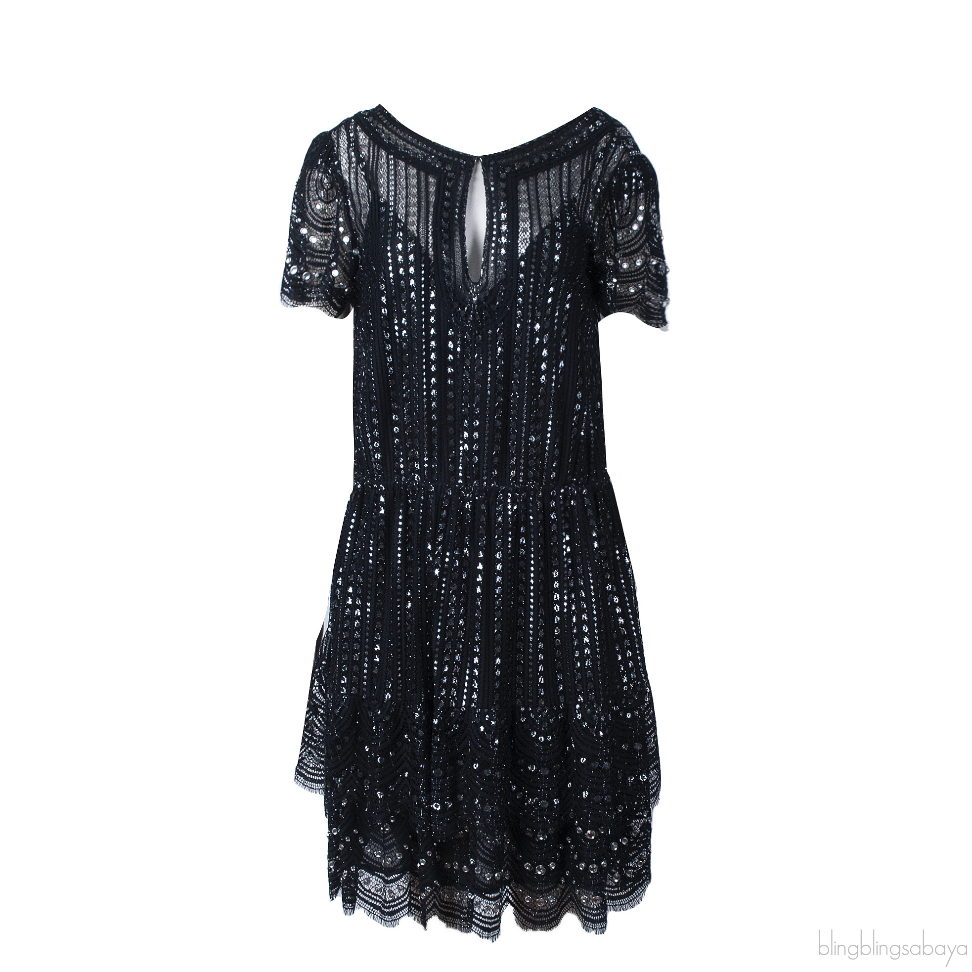 Michael Kors Black Lame Studded Lace DressThis Michael Kors Black Lame Studded Lace Dress is crafted from polyester and metallic threads. This dress features a slightly see-through studded lace overlay, scallop edges, short sleeves, split neckline and mini-length.