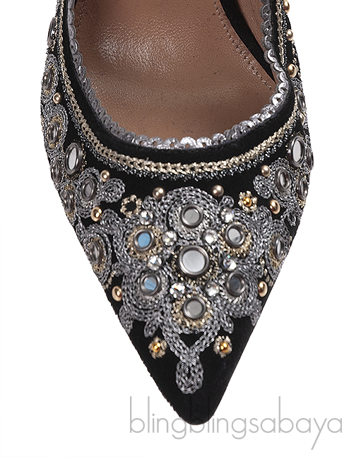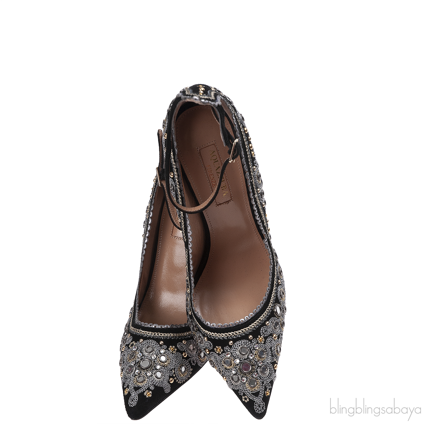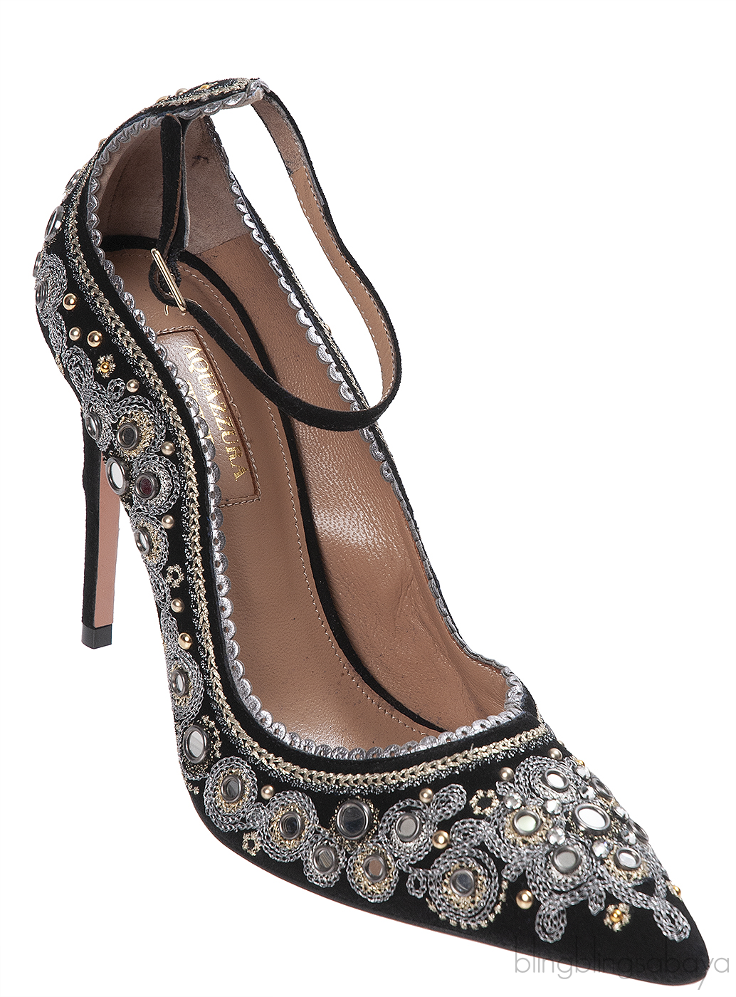These Black Embellished Jaipur Pumps from Aquazzura from black suede upper decorated with bright mirrored and embroidered embellishment and leather lining. These heels features a pointed toe, buckled ankle straps, and are set on slim stiletto heels for a leg-lengthening effect.