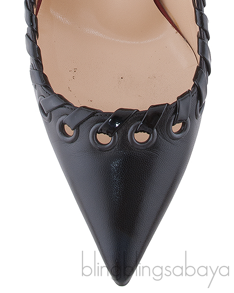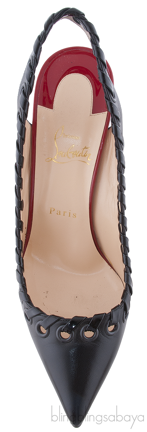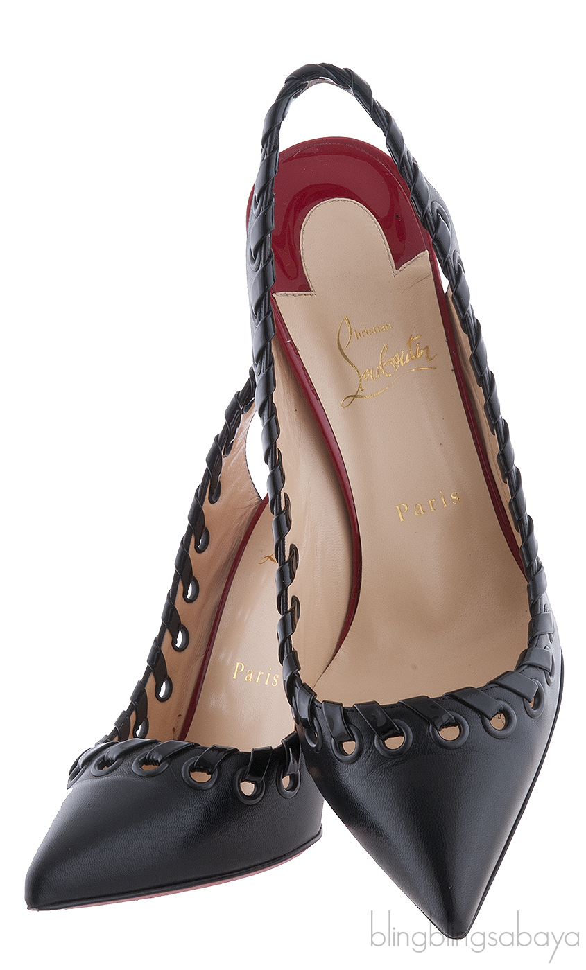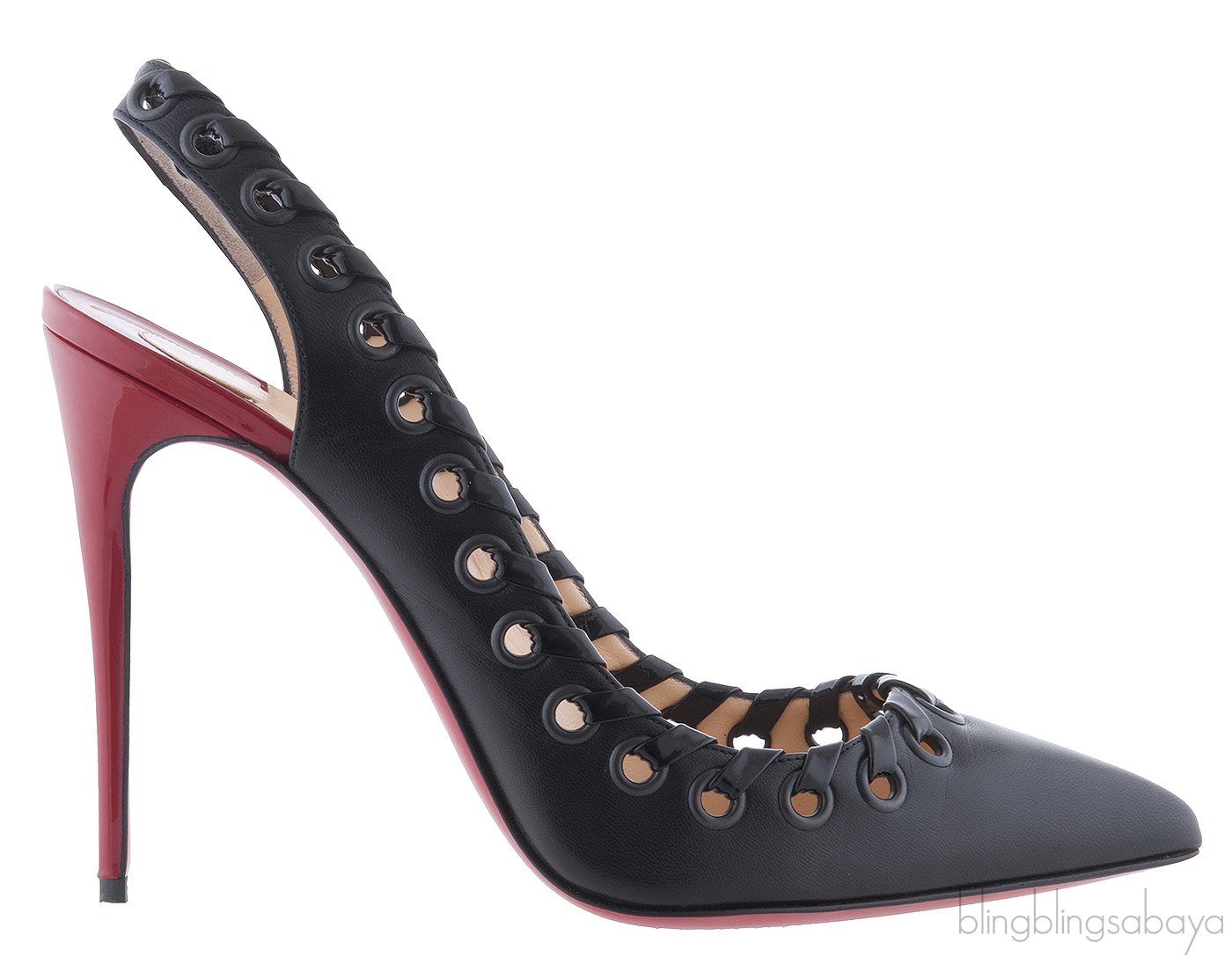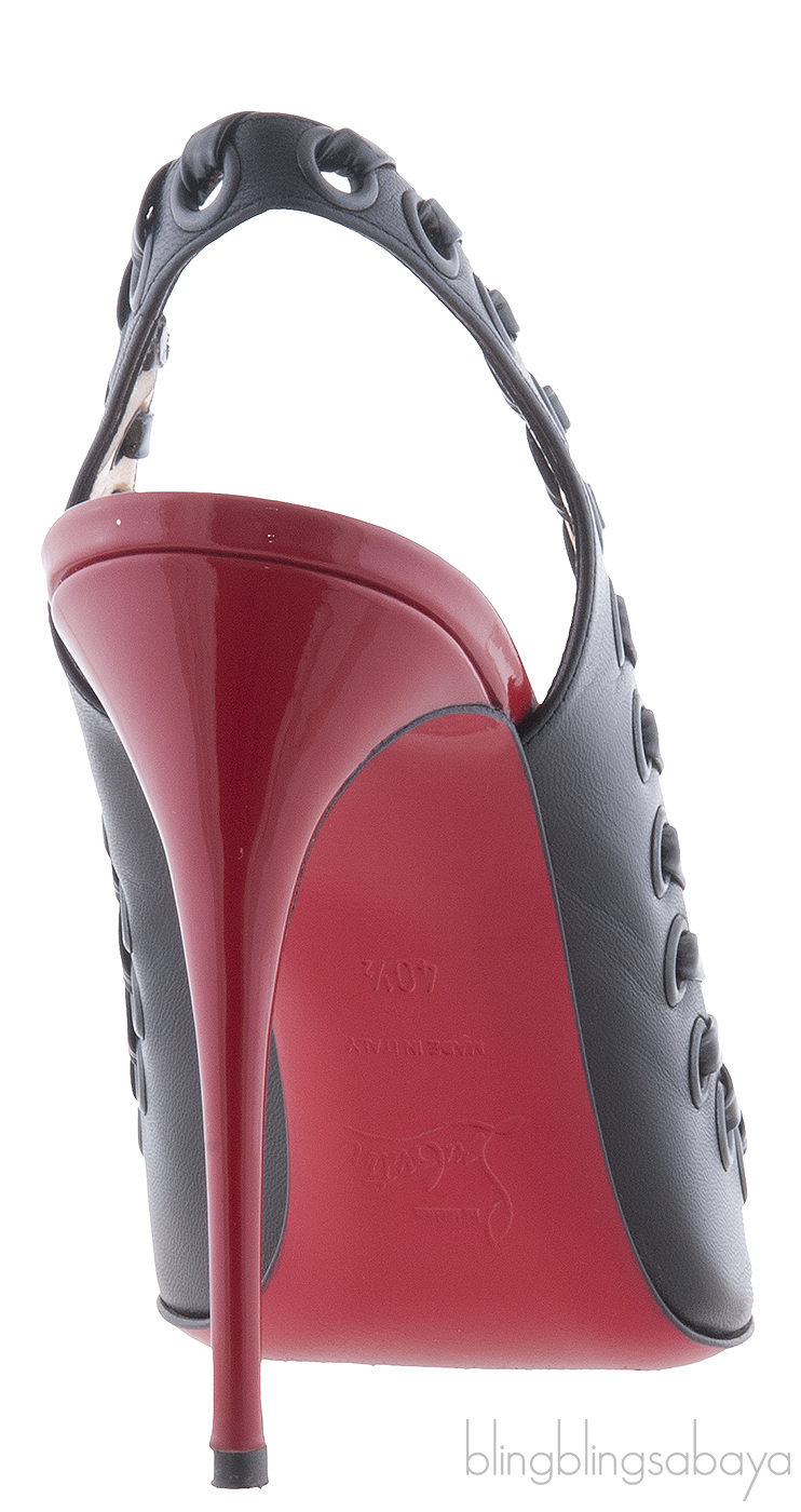 This Black leather Ostri Sling 100 Heels from Christian Loubountin features a pointed-toe slingback pumps with cutouts and covered heels. aesthetic with elegant pointed toe and edgy whipstitched grommets.