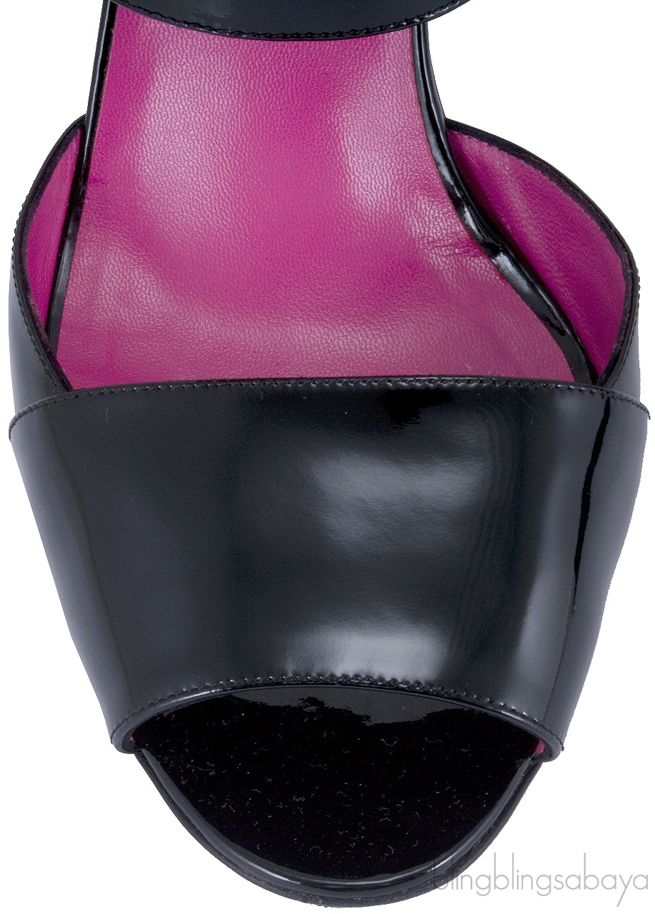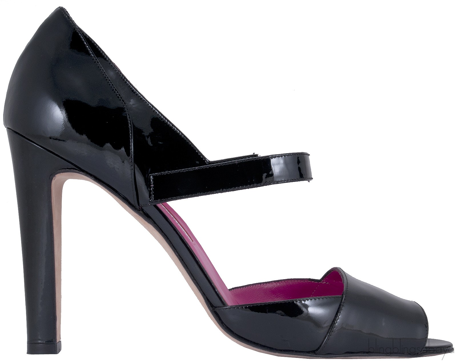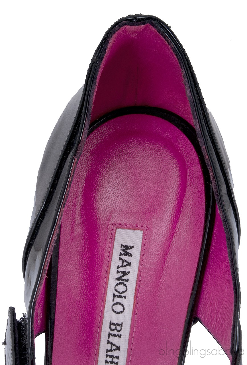 This Black Patent Strap Heels from Manolo Blahnik is crafted in elegant black patent leather lined with exciting pink leather. These shoes features a round almond peep toe, leather lined insole, strap detailing with magic tape fastening and covered heels measuring 100 mm high.