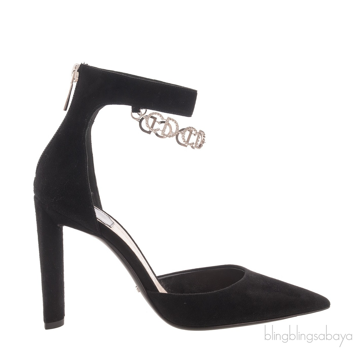 These Black Suede Pointed Slingback Sandals from Christian Dior are crafted from black suede leather with black leather lining. These stunning heels features a pointed tow, slingback with zip fastening at the heel counter, silver "CD" metal logo whimsically dangling on the strap, covered heels measuring 100 mm high,leather lined sole and leather sole.