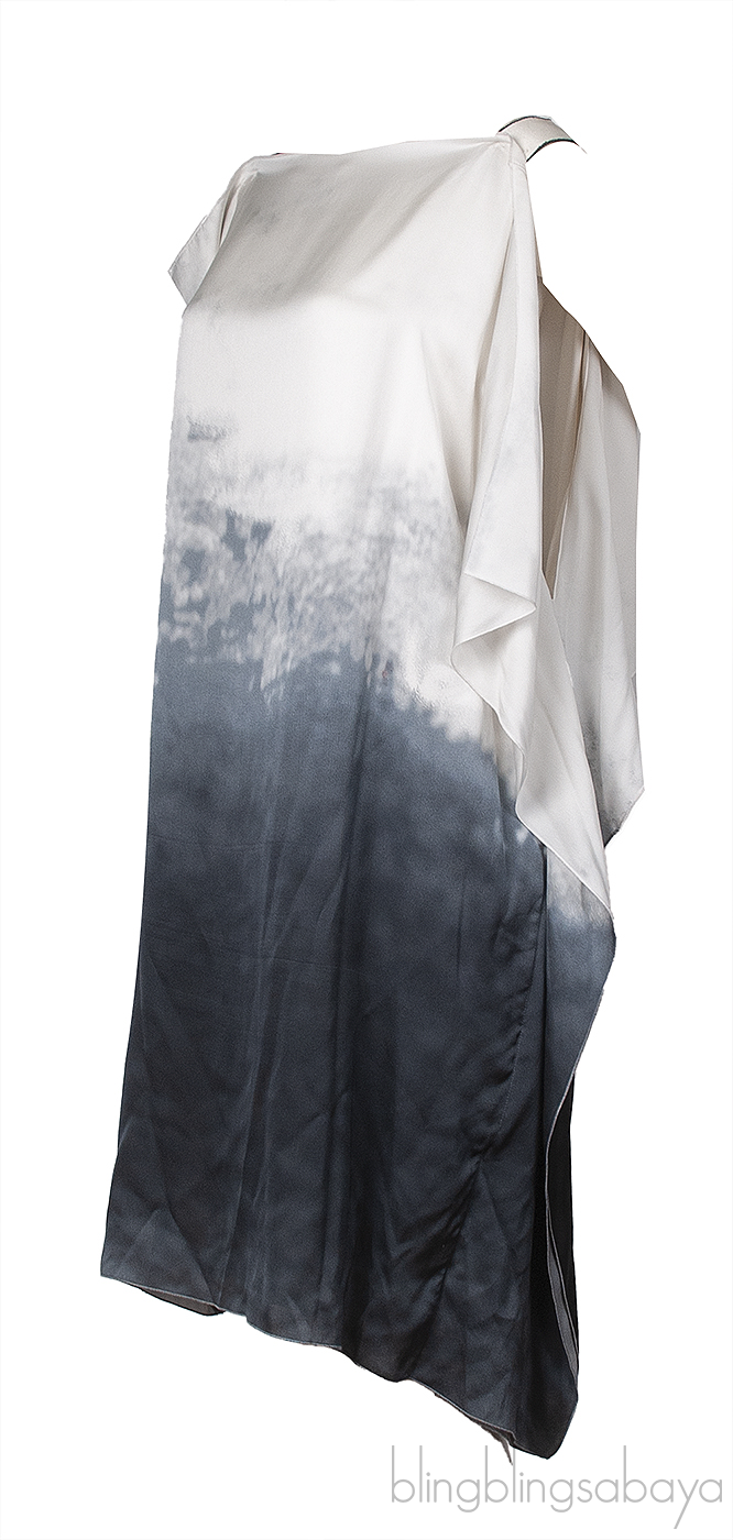 This Bottega Veneta Gradient White Blue Grey Silk Dress is crafted from 100% Silk fabric. in white and grey gradient hue featuring a shoulder strap, sleeveless, asymmetric cut design