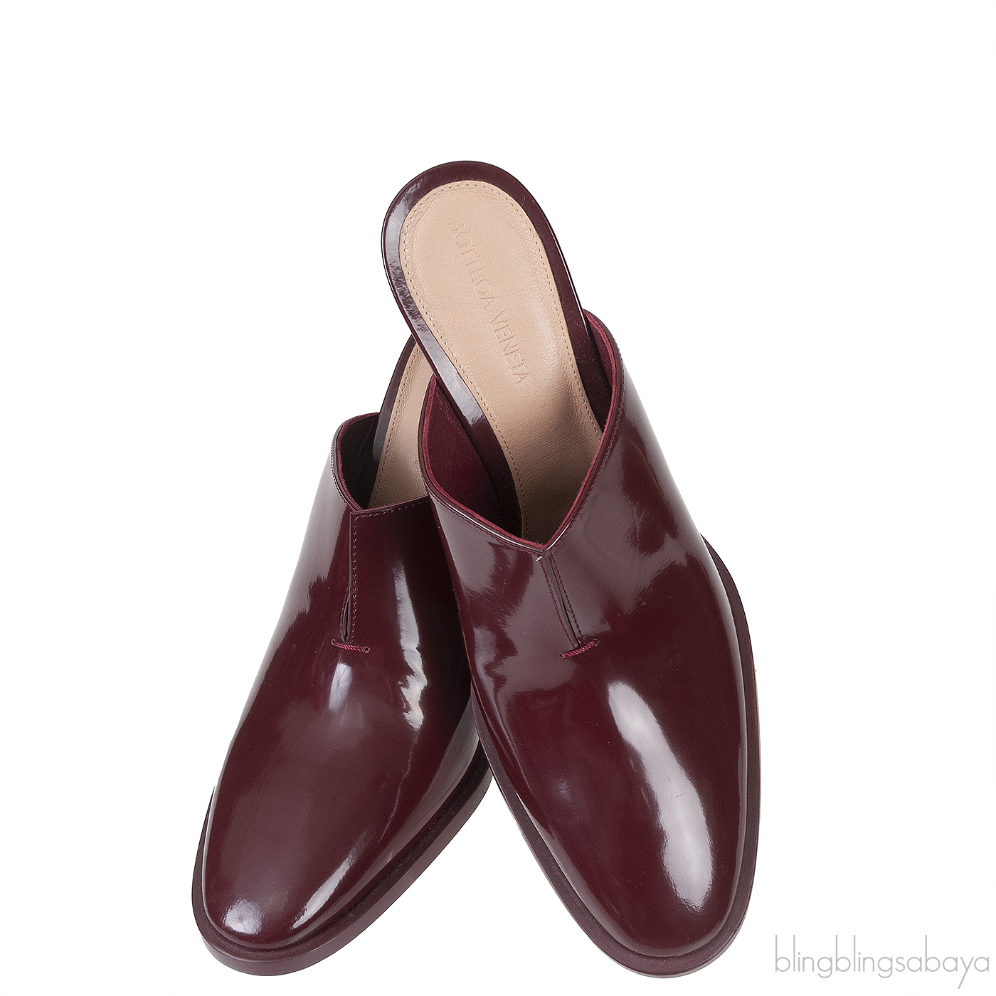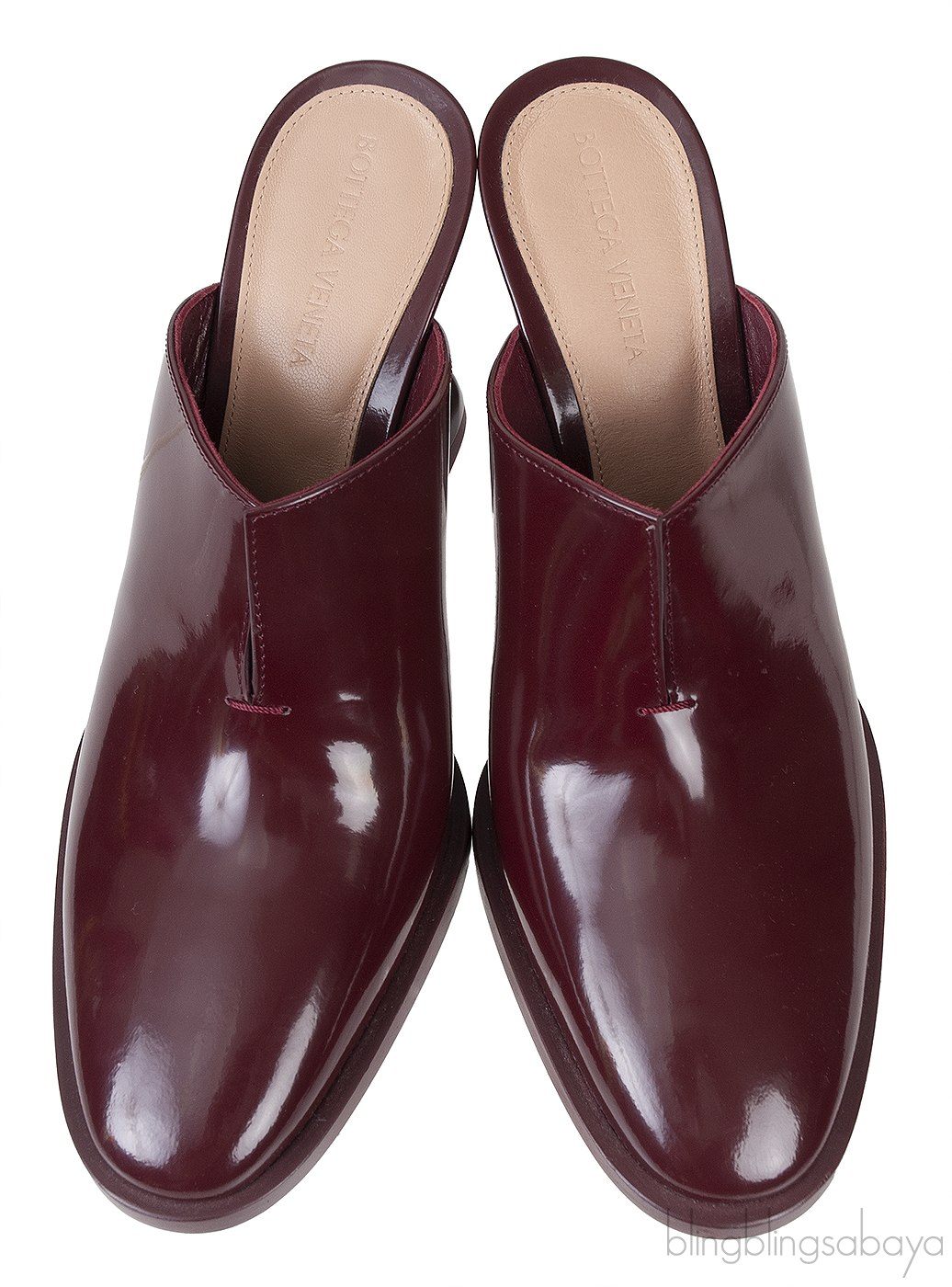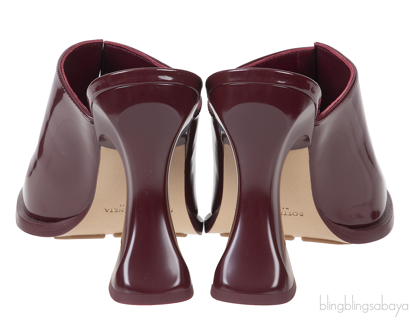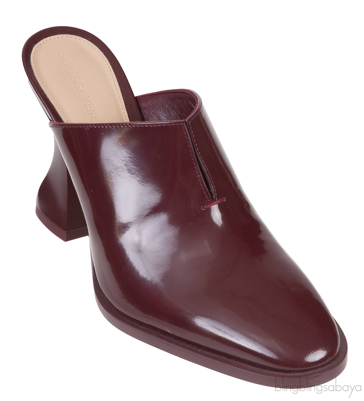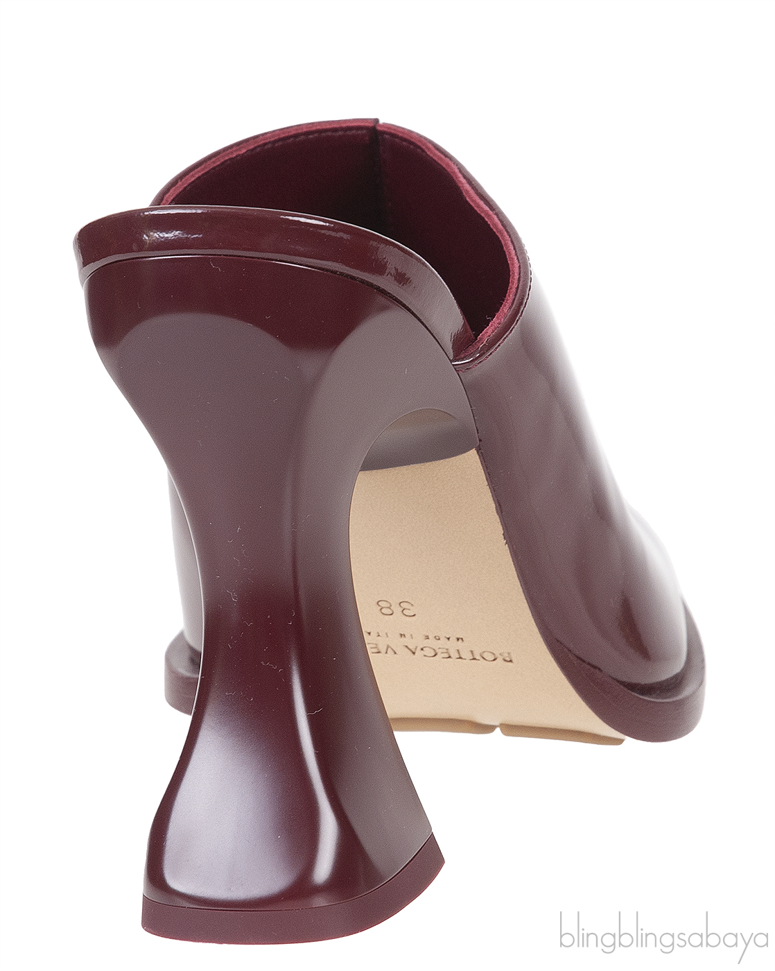 These Bottega Veneta Leather Cha-cha Mules are crafted from maroon patent leather with leather lining. These mules features a pointed toe, leather lined insole and sole, and sculptural heels measuring 100 mm high.