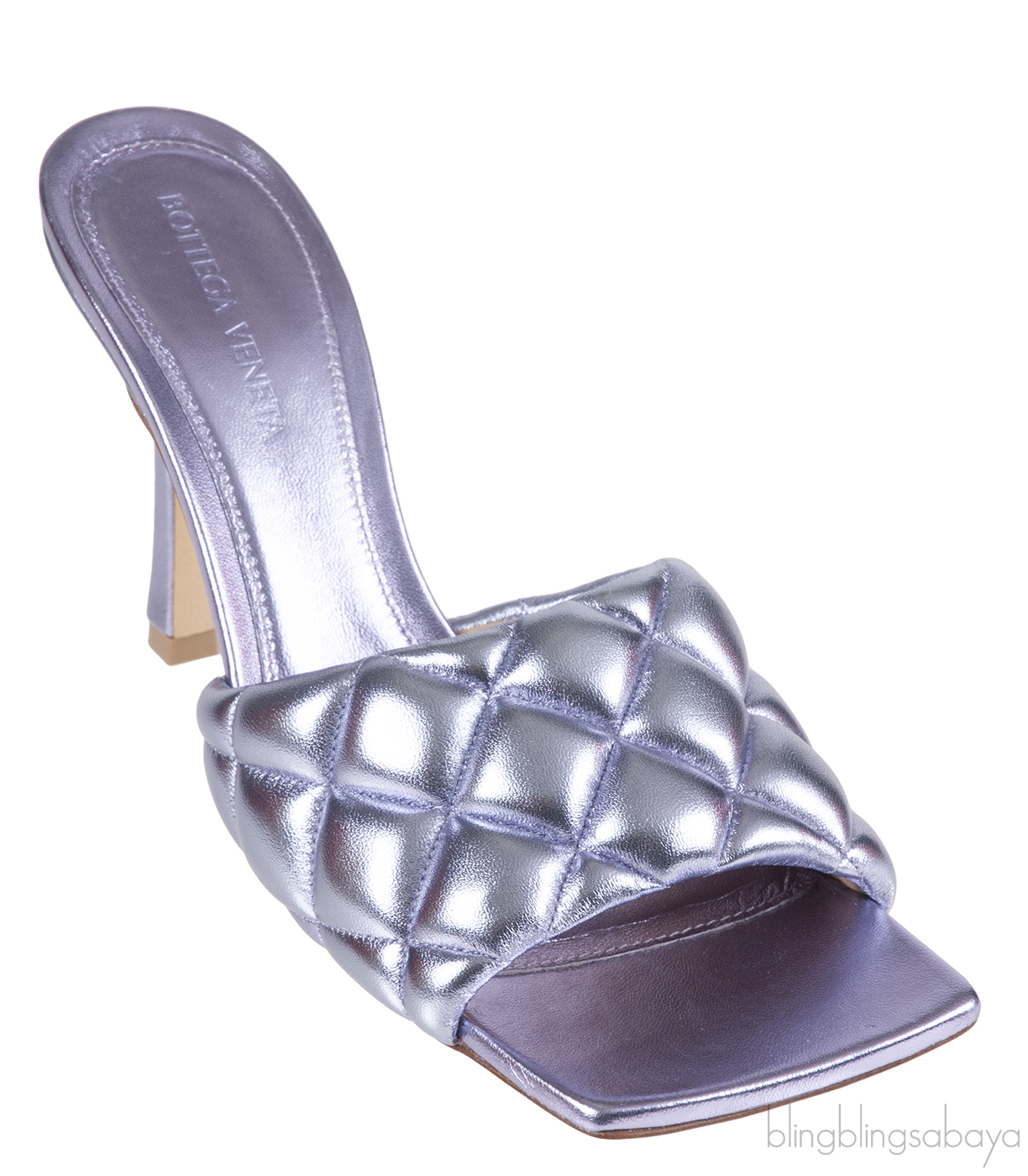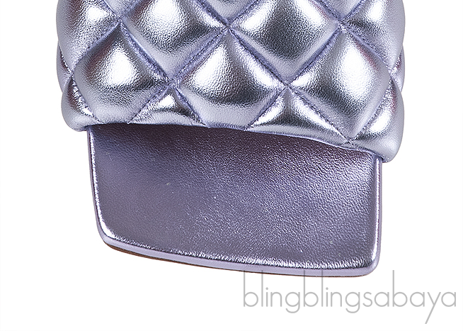 These Bottega Veneta Metallic Purple Padded Lido Heeled Mules are crafted from metallic purple quilted leather upper and leather lining. These sandals features a padded diamond quilted upper, square toe, leather insole and leather sole and heels measuring 90 mm.