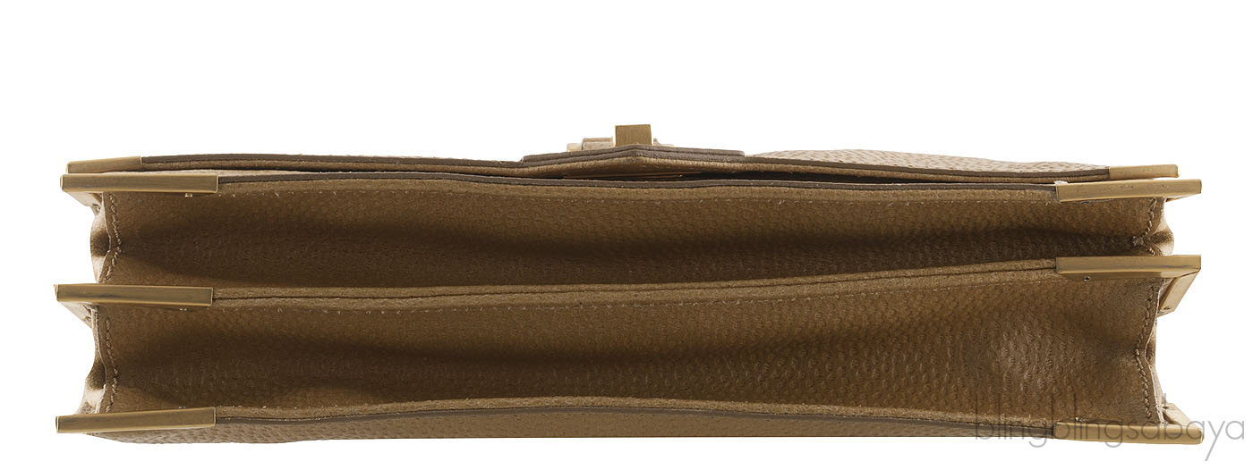 This Brown Clutch Shoulder Bag from Fendi is made from brown textured leather accented with brass metal. This clutch features a flap cover with with logo embossed turn-lock closures and gold metal cornering, nude leather interior lining with two major compartments and interior zip pocket. It has long detachable and adjustable shouldet strap and top handle for clutch use.