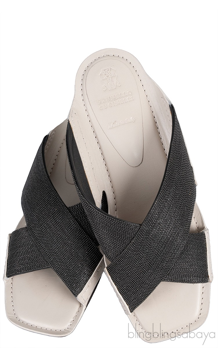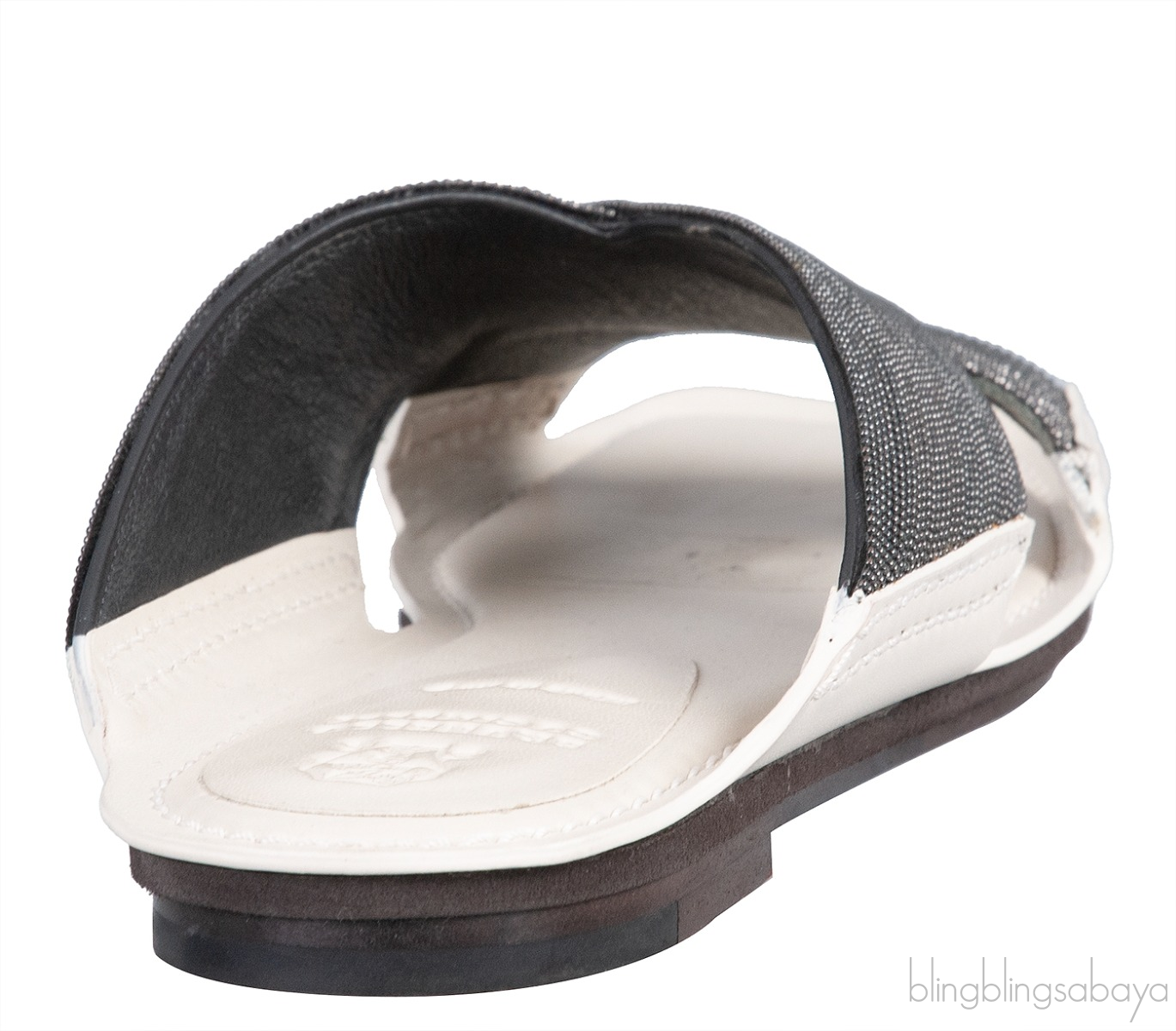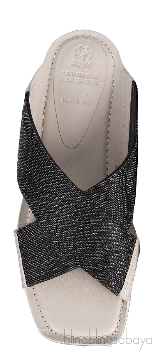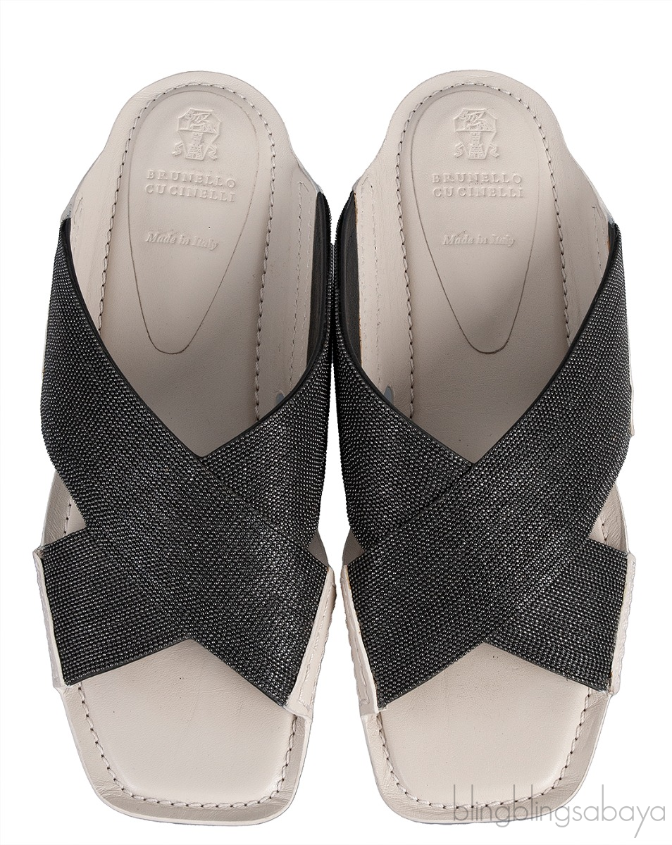 These Beaded Crossover Slides from Brunello Cucinelli are crafted in grey leather upper fully encrusted with beads and white leather lining. These flat slides features a crossover top wth peep square toe, leather lined insole, and leather sole.