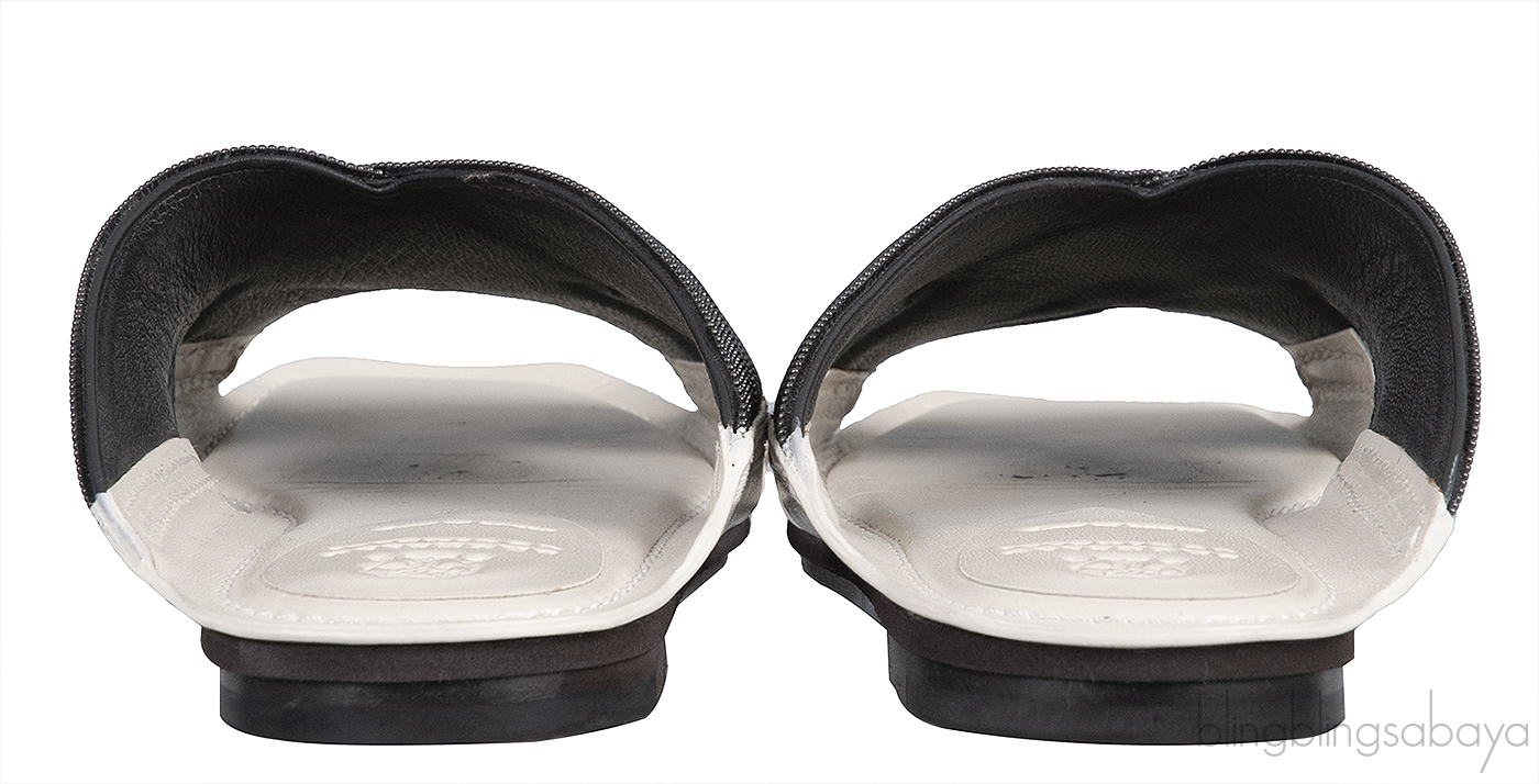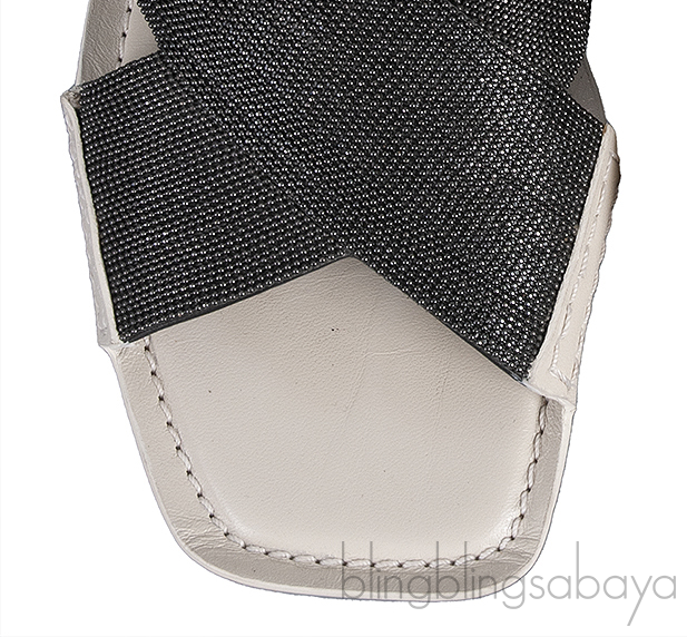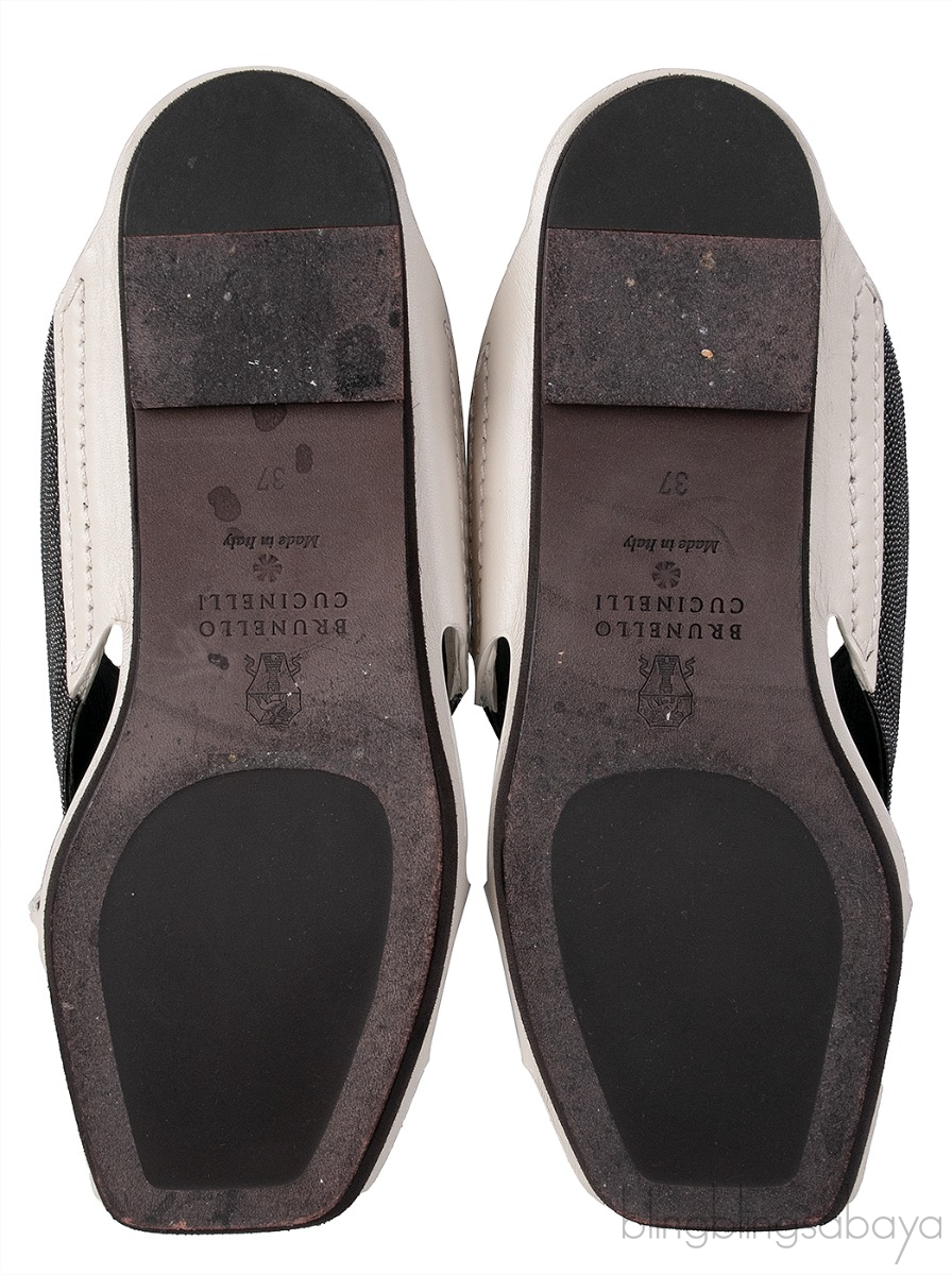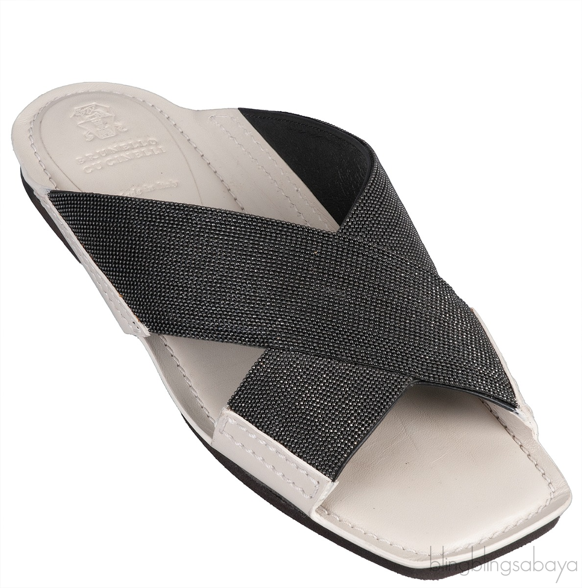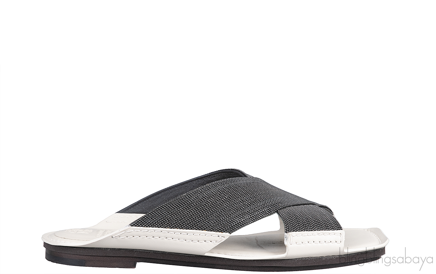 These Beaded Crossover Slides from Brunello Cucinelli are crafted in grey leather upper fully encrusted with beads and white leather lining. These flat slides features a crossover top wth peep square toe, leather lined insole, and leather sole.