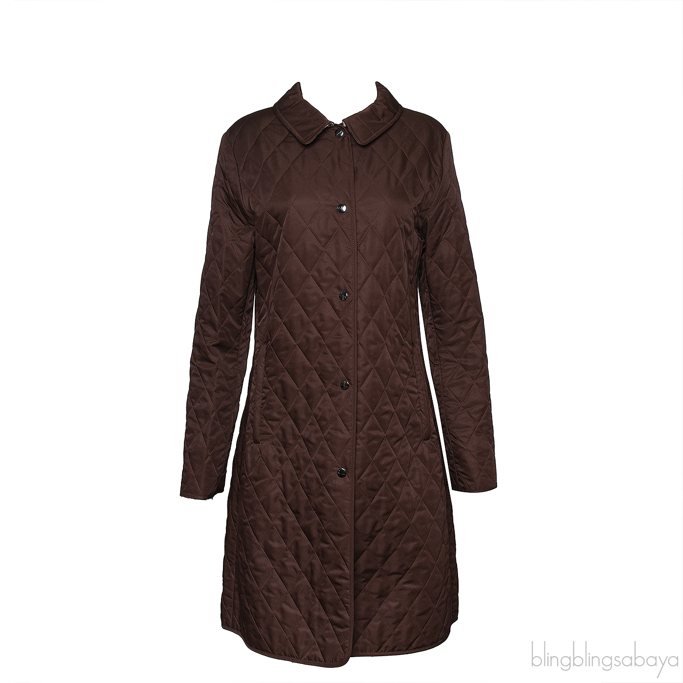 This Burberry Brown Quilted Coat is crafted from 100% Polyester, Lining 50% Cotton and 50% Polyester in brown hue. This coat features a diamond quilted design, classic collar, side zip pockets, long sleeves, silver button fastening through the front and signature checkered print fabric inner lining.