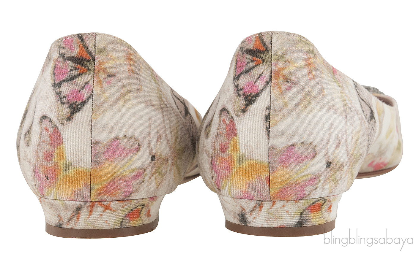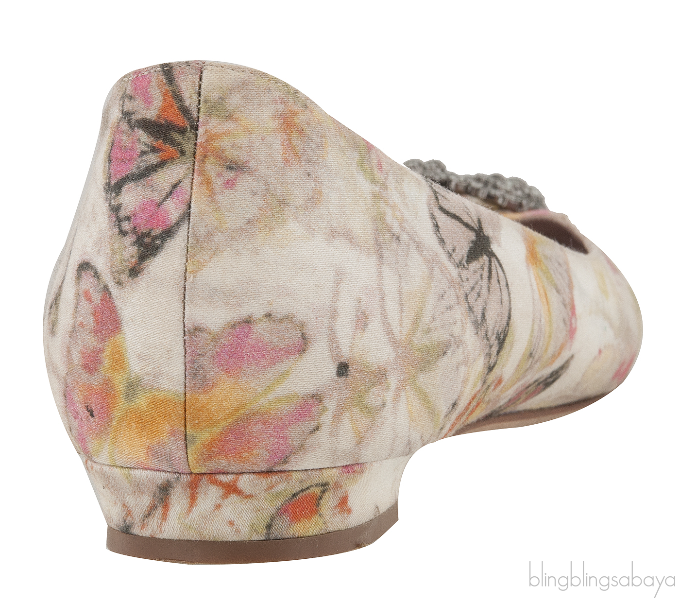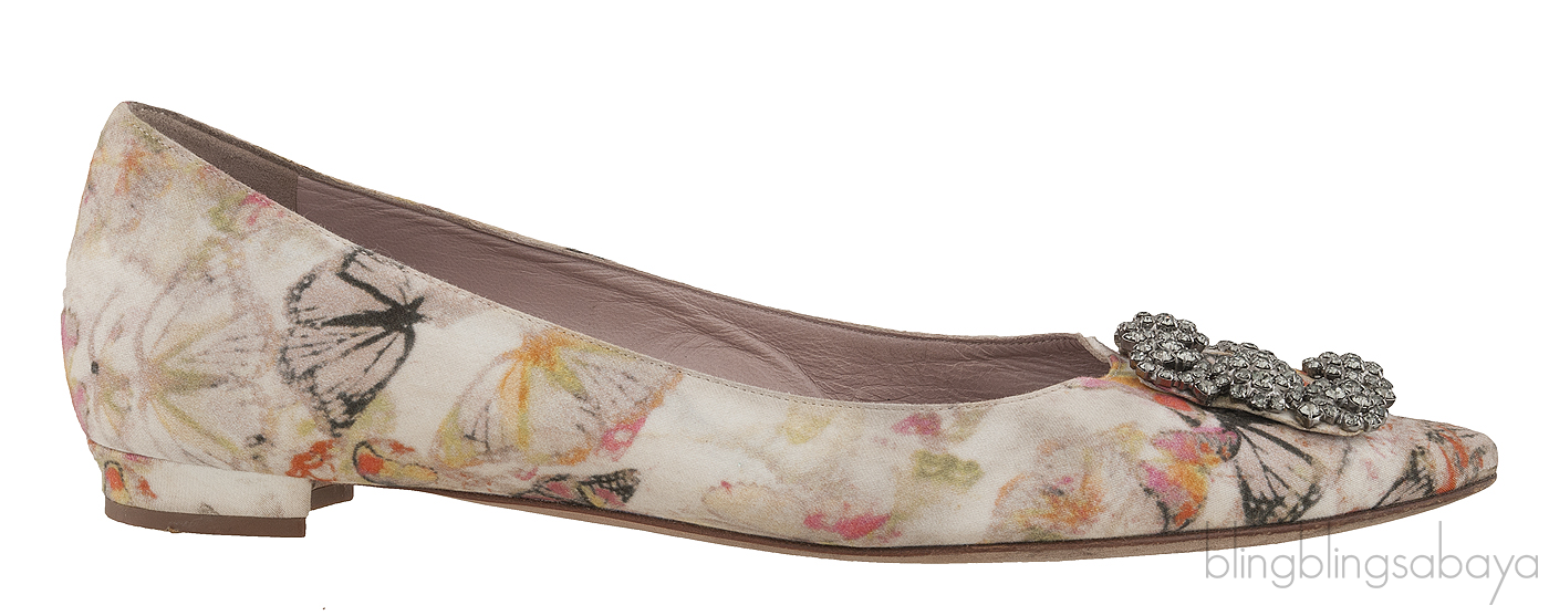 TheseButterfly Print Hangisi Flat from Manolo Blahnik features multi-coler butterfly print satin upper and nude leather sole. Slightly pointed toe and a crystal brooch embellishment on the vamp.