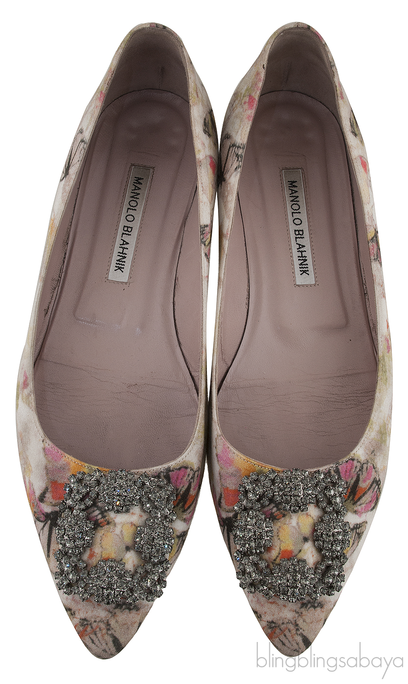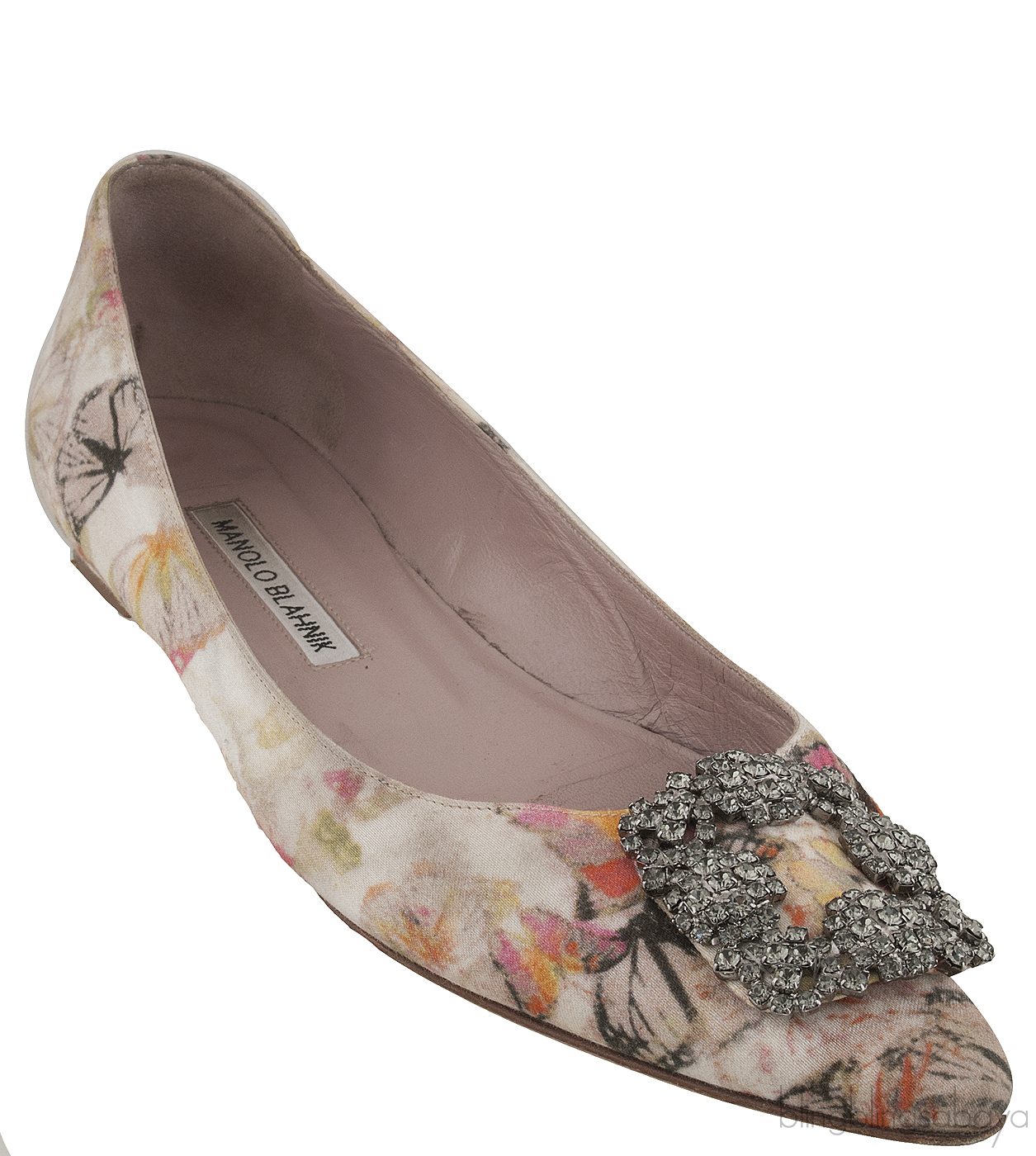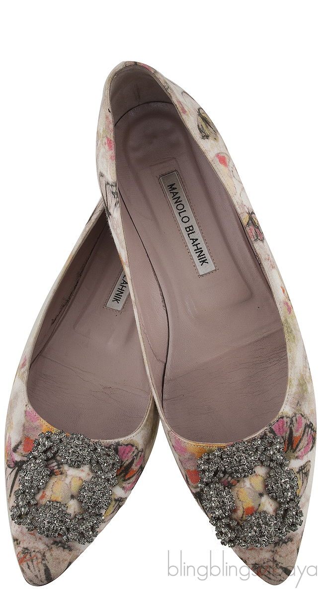TheseButterfly Print Hangisi Flat from Manolo Blahnik features multi-coler butterfly print satin upper and nude leather sole. Slightly pointed toe and a crystal brooch embellishment on the vamp.