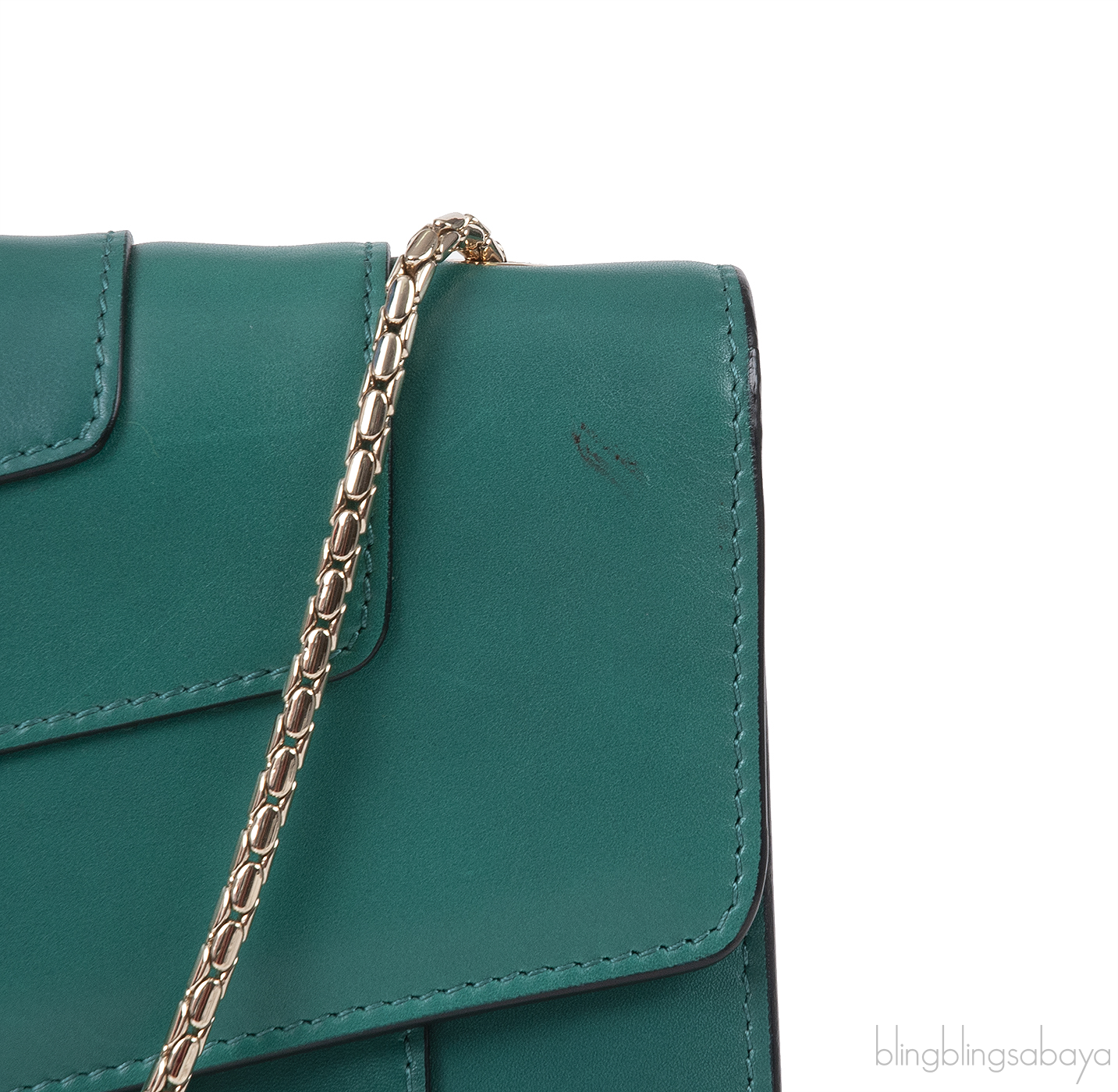 This enticing Serpenti Crossbody bag is beautifully crafted in dark green Calfskin Leather. This bag features the most famous light gold \"Serpent\" head closure in black & white enamel with seductive eyes in malachite that perfectly matches with a precious shoulder snake body shape chain.