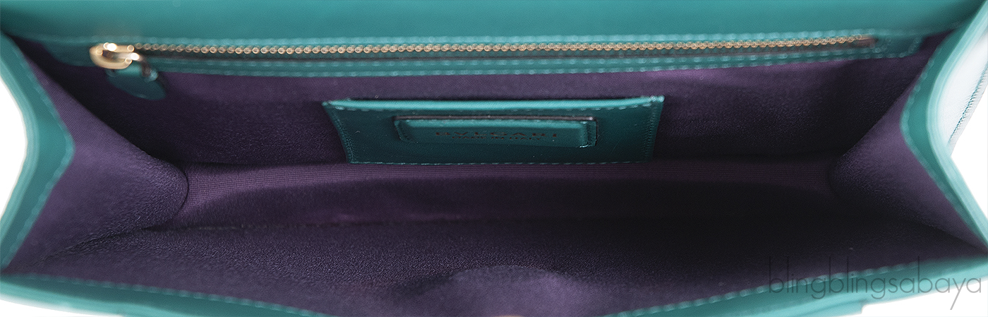 The single flap opens to reveal an interior lined with purple canvas with one open pocket inside