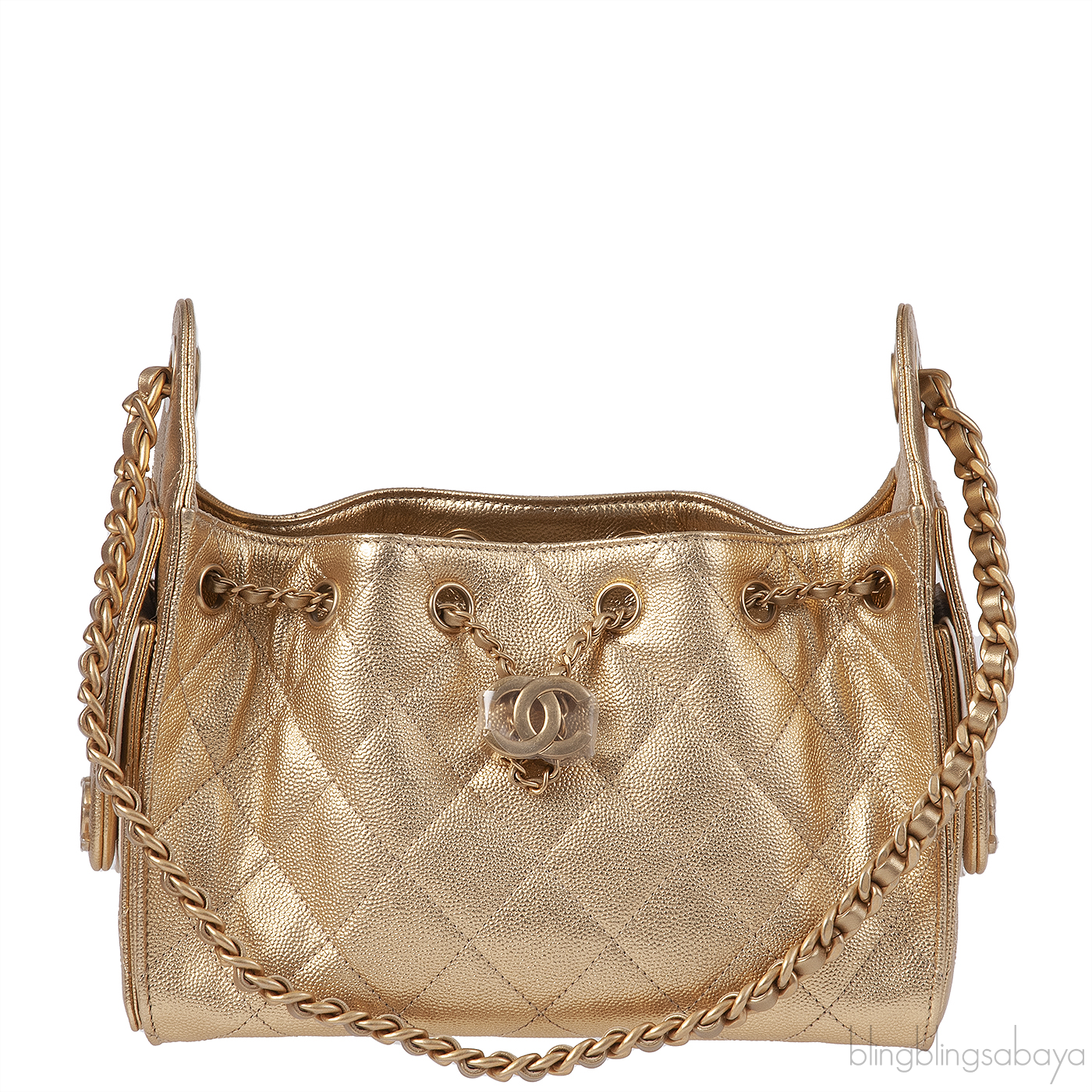 This Chanel 25 Mini Gold Metallic Grained Leather with Gold Hardware from the Cruise 2025/26 Collection blends modern glamour with classic Chanel craftsmanship. Crafted from diamond-quilted metallic gold calfskin leather, it features gold-tone metal accents including the CC logo, handle details, and the leather-interwoven chain strap. The bag is secured with a drawstring closure and opens to an interior lined in fabric, complete with one small wall pocket and two side patch pockets. It also includes CC-embellished exterior pockets for added style and functionality.
