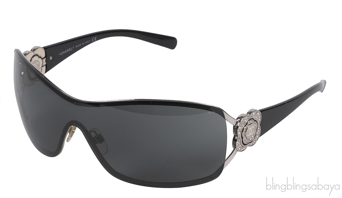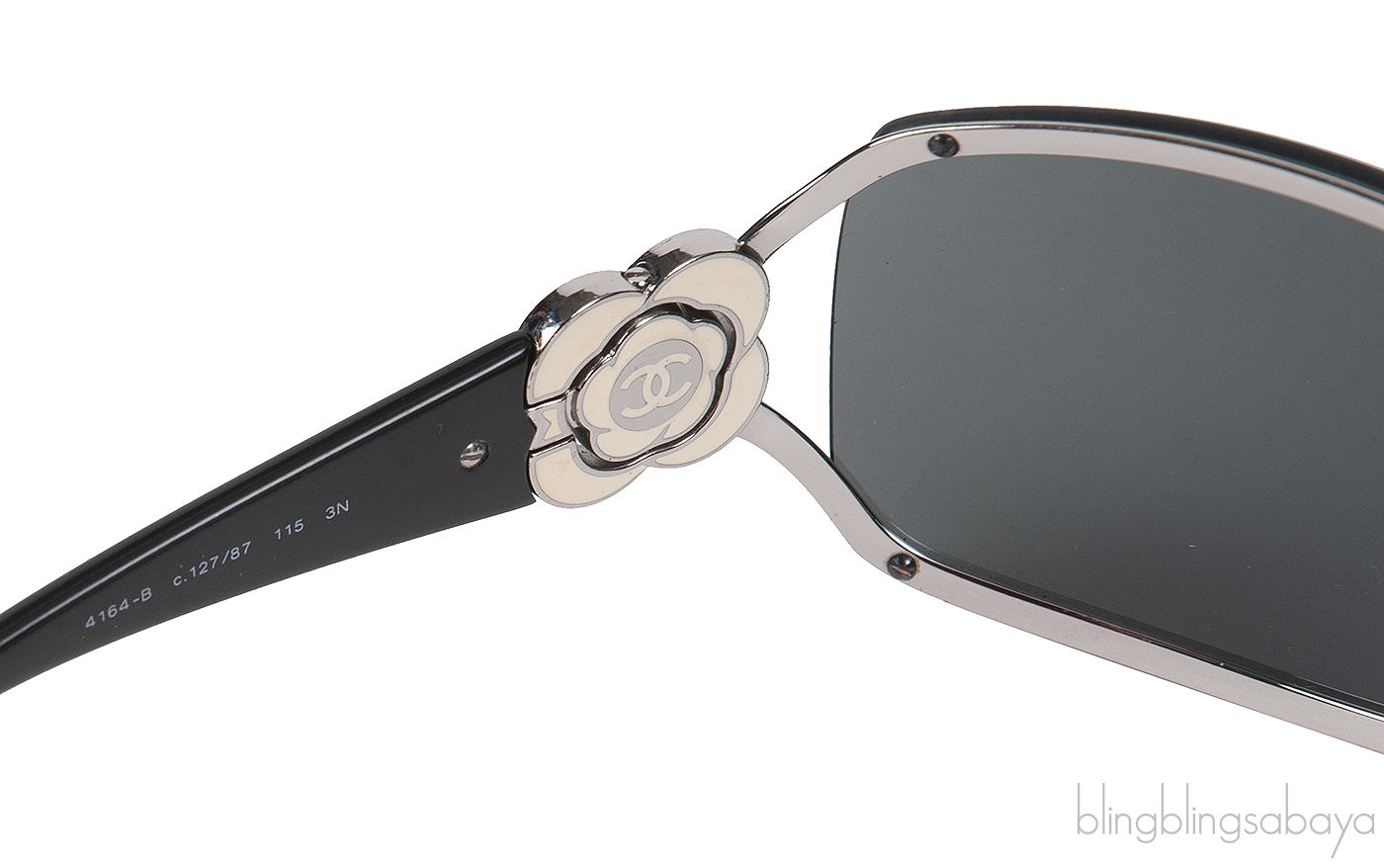 This Camellia CC 4164-B Black Sunglasses from Chanel is made silver metal frame with one piece black lens. The arms are black and feature a black and silver camellia and a Chanel CC logo.