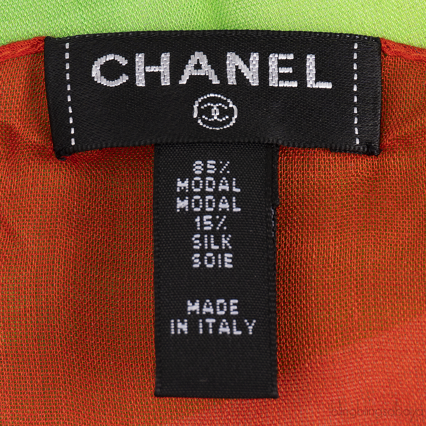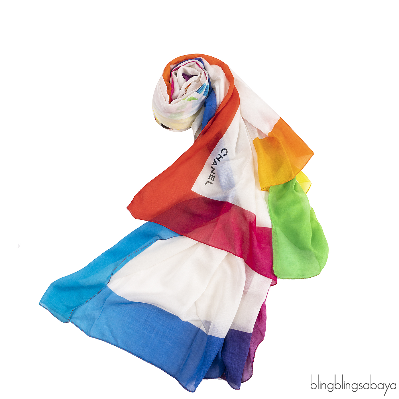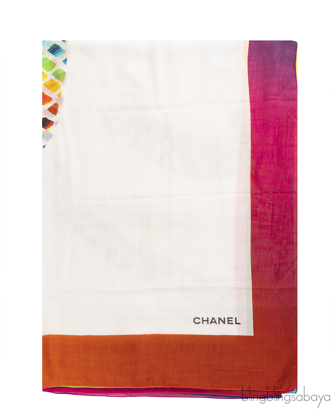 Crafted from a luxurious blend of 85% modal and 15% silk, this piece offers an ultra-soft, lightweight feel with a graceful drape. It features a vibrant multi-color trim that beautifully frames the design, while the oversized CC logo at the center adds a bold yet sophisticated signature touch.