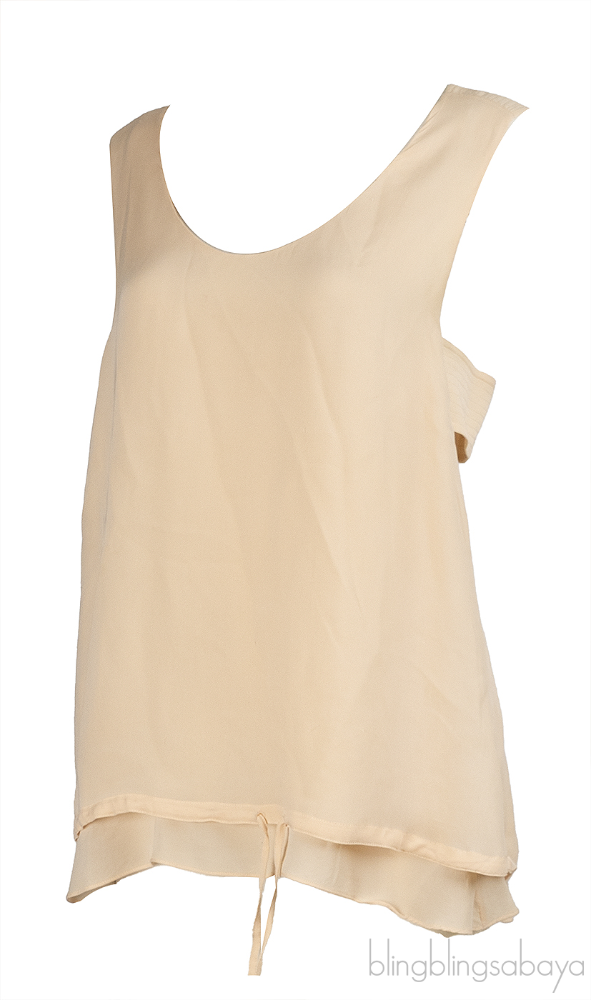 This Chloe Apricot Pink Sleeveless Top is crafted from 100% Silk in apricot pink featuring a scoop neckline, sleeveless, cut-out at back, double layered and drawstring at hem, pleated drapes at back with strap across the bust line.