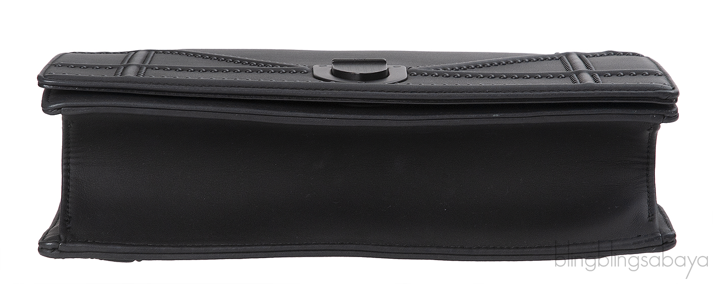 This stunning ultra matte shoulder bag features an oversized cannage stitching design with crest shape clasp in black metal at flap cover. It has a long chain shoulder strap with open work and engraved links. Interior is fully lined with black fabric revealing a roomy interior with one zip pocket and open patch compartment.