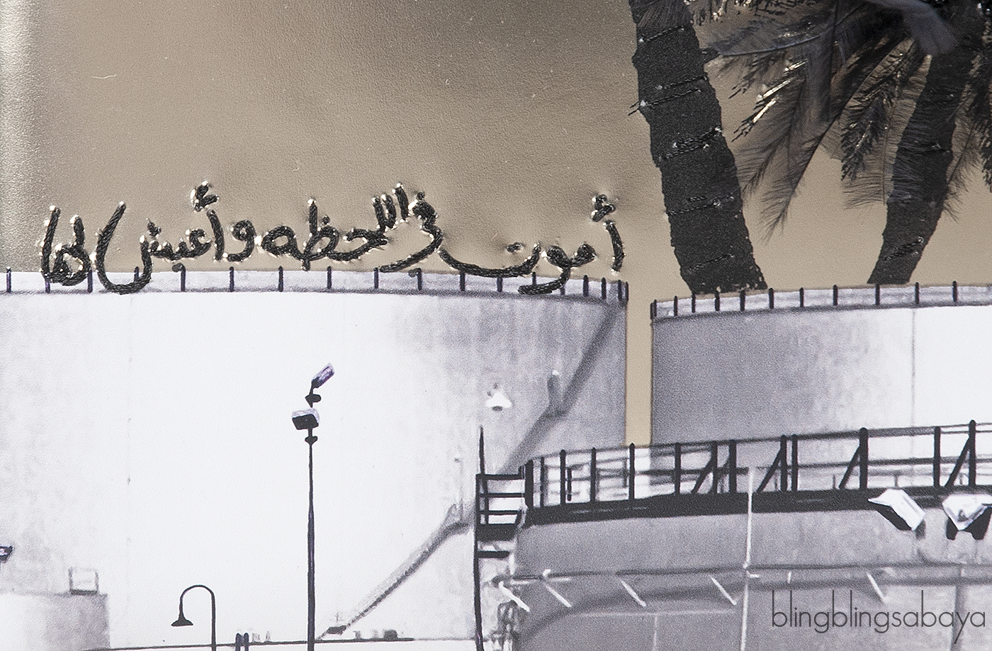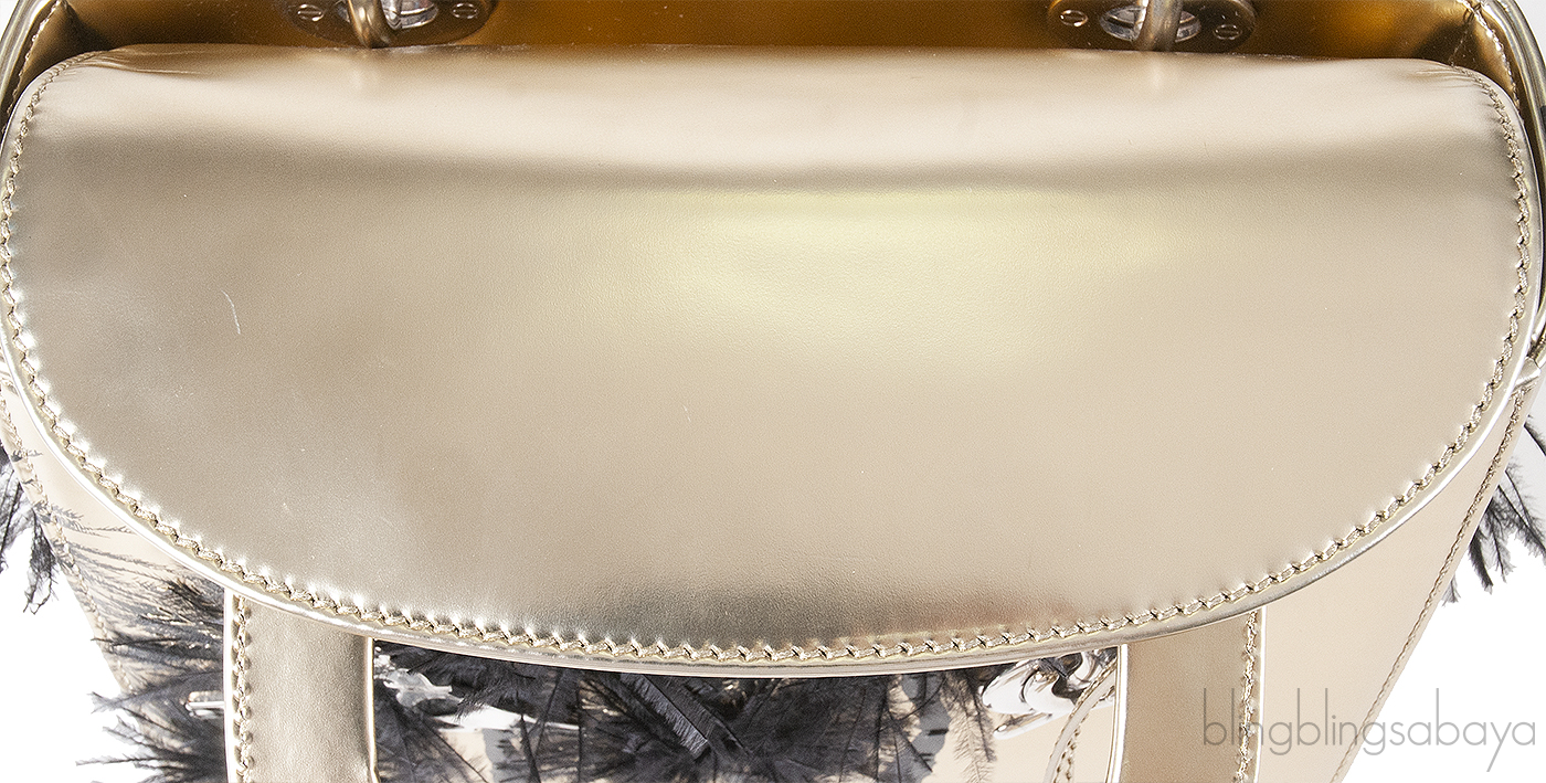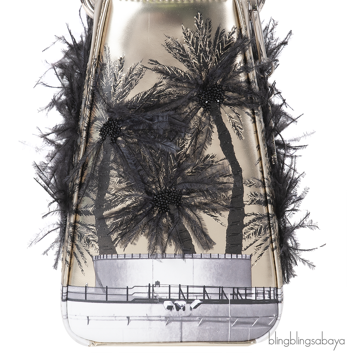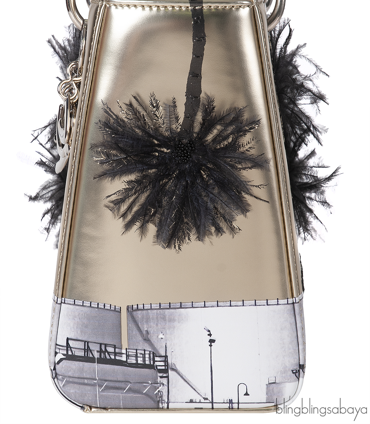 This Christian Dior Lady Dior Art \"Manal Aldowayan\" Metallic Palm Art Bag from the Dior x Manal Aldowayan collaboration is crafted from luminous metallic gold leather, accented with silver hardware. The bag features a striking palm tree artwork, adorned with black feathers and layered with Arabic script, a powerful tribute to Middle Eastern heritage and contemporary expression.