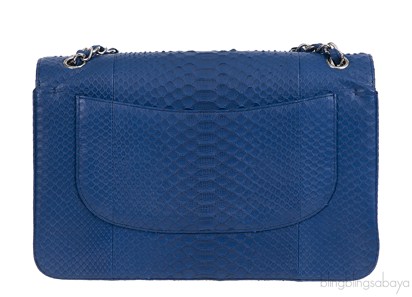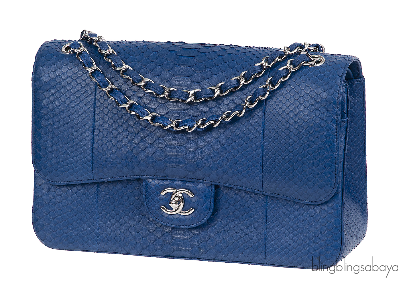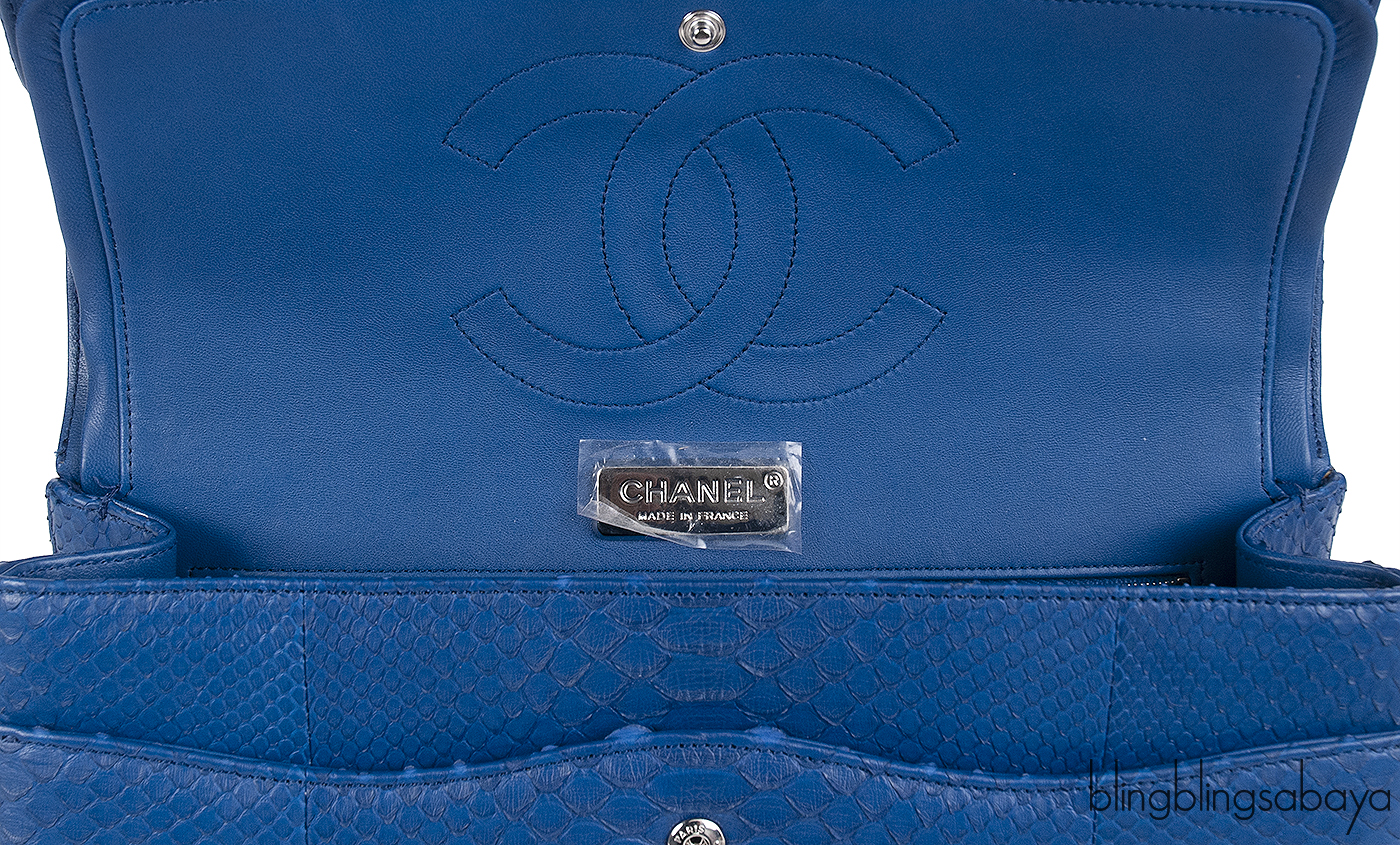 Gorgeous as ever! This charming and beautiful Chanel Classic Flap bag features a blue colored exotic Python accented with Silver Hardware. It features the famous twist lock CC closure in shiny gold tone and has a double chain linking shoulder strap that is interlaced with the python leather.