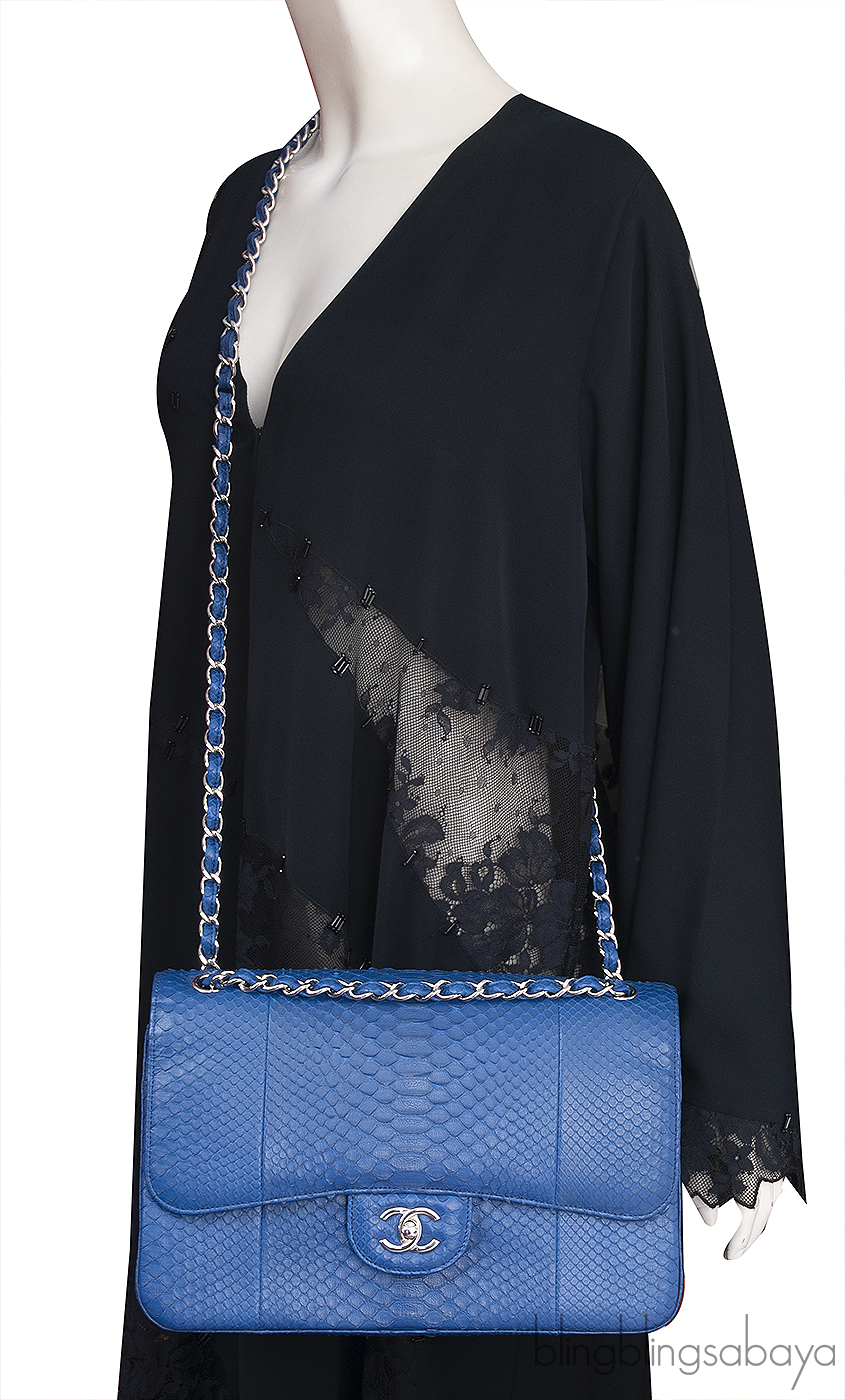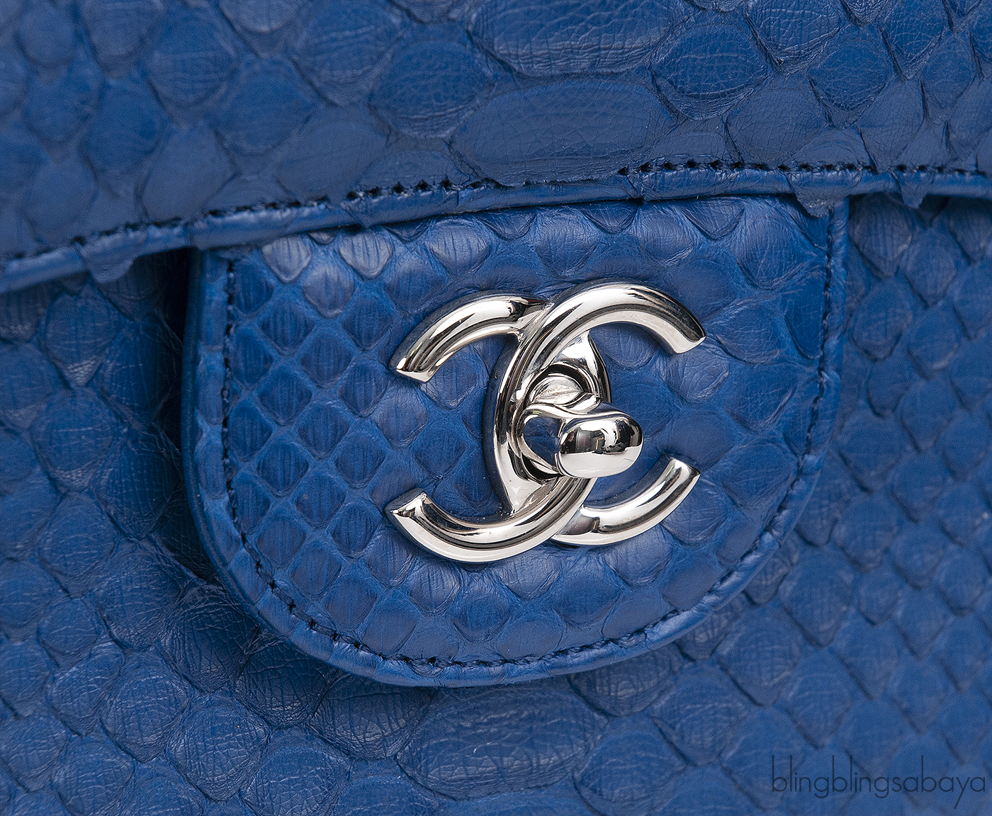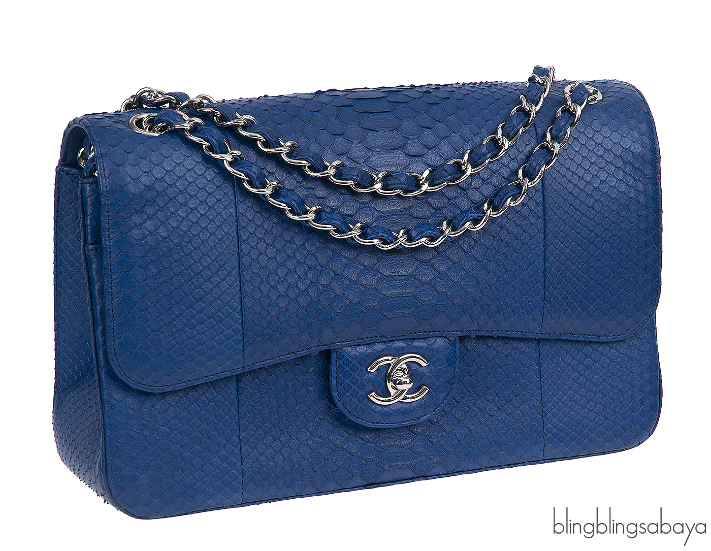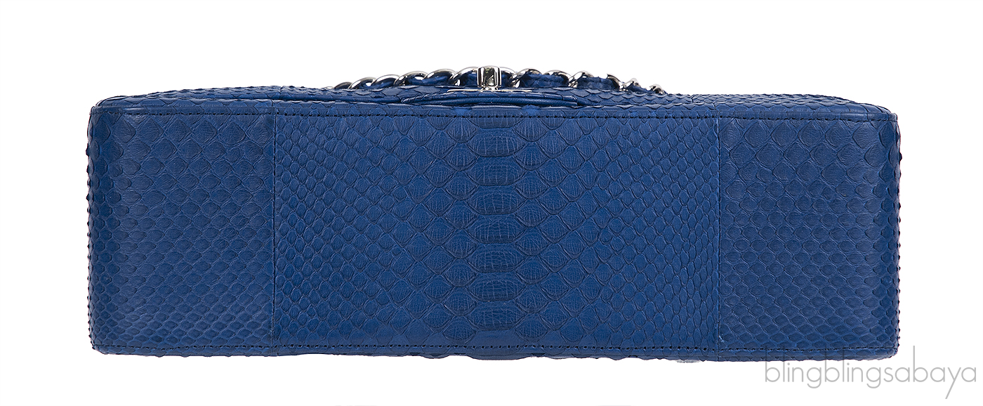 Gorgeous as ever! This charming and beautiful Chanel Classic Flap bag features a blue colored exotic Python accented with Silver Hardware. It features the famous twist lock CC closure in shiny gold tone and has a double chain linking shoulder strap that is interlaced with the python leather.