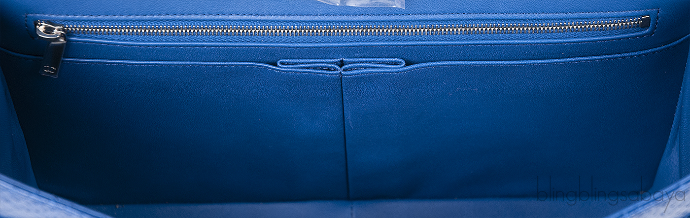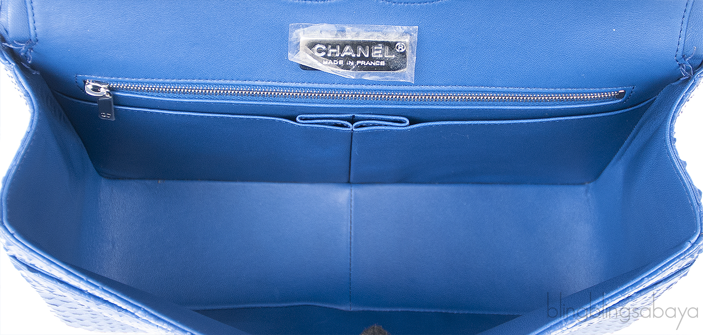 This beautiful bag features zippered compartment on the front flap while the second flap shows a large stitched CC logo. The roomy interior is made of coordinating blue leather and reveals several pockets for easy organization.