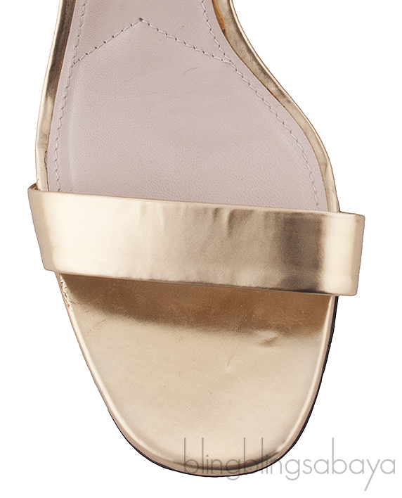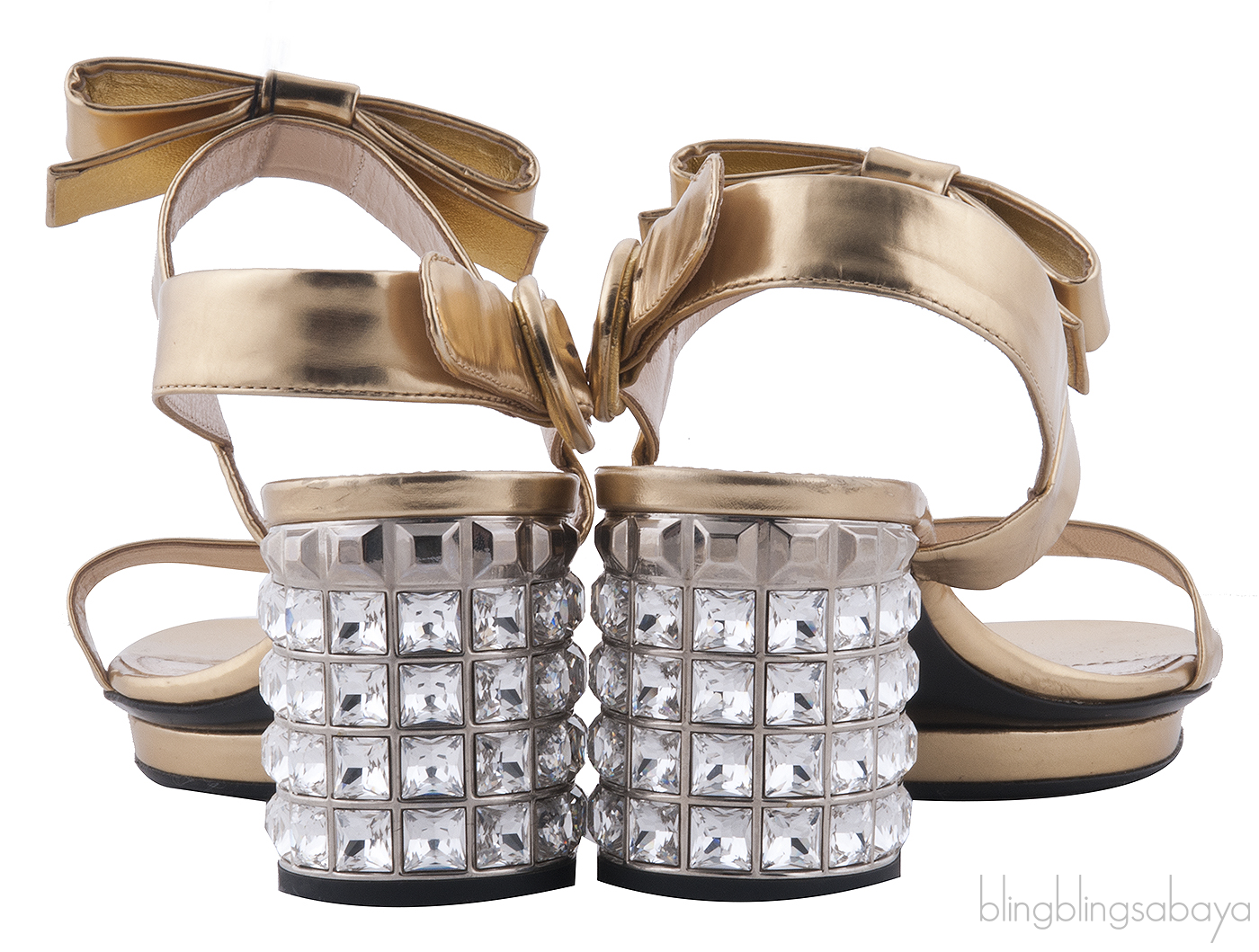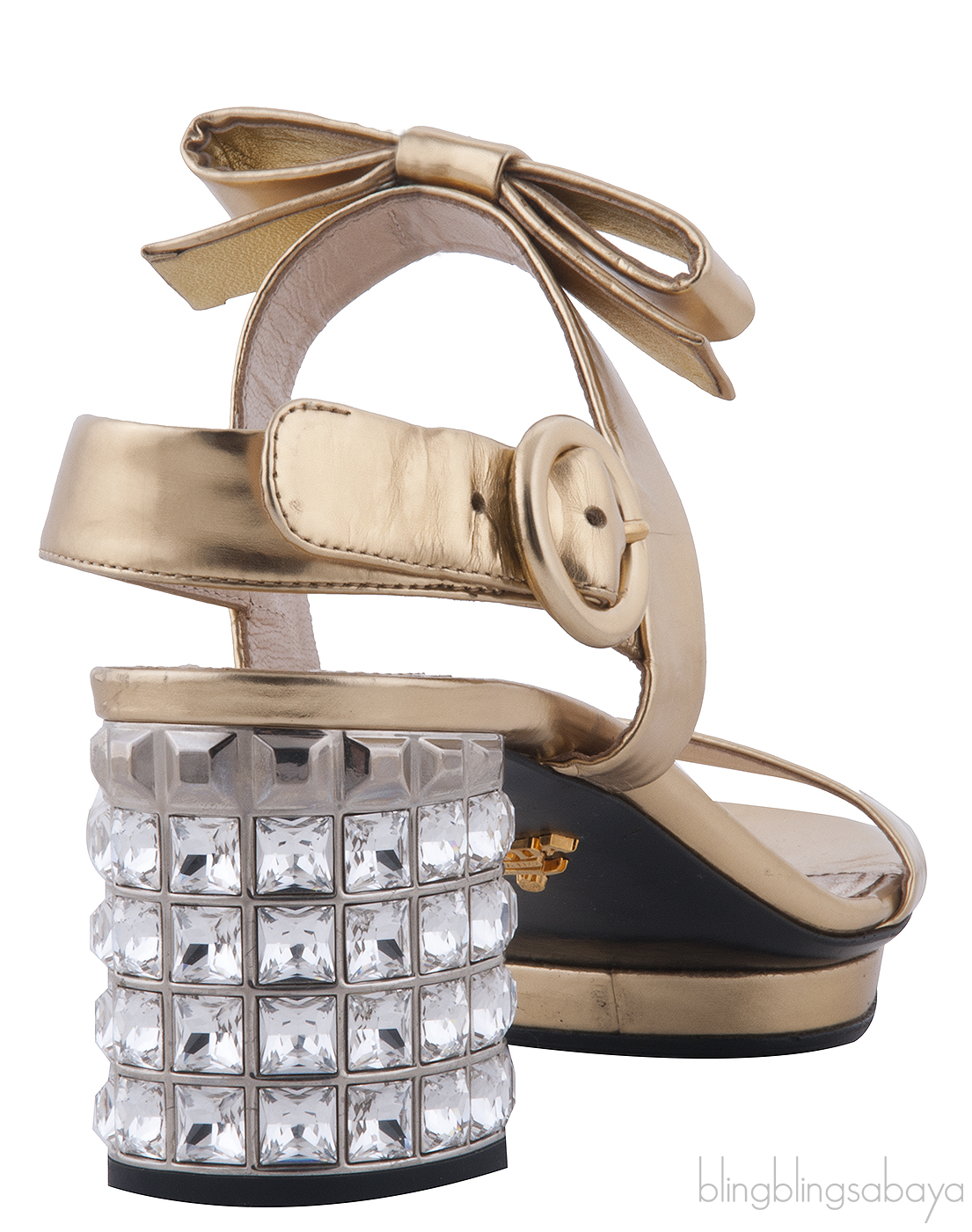 This Crystal Heel Ankle Strap Sandals from Prada is crafted in gold patent leather upper with nude leather lining. This sandals features a strap leather vamp open toe, bow detailing so upper strap, gold buckle fastening, leather lined insole, 70 mm high round block heel fully covered with crystals and rubber outsole