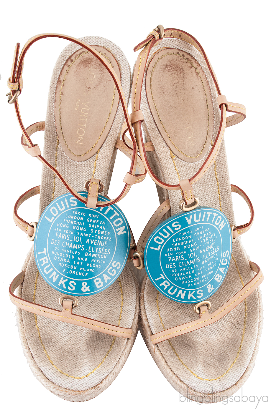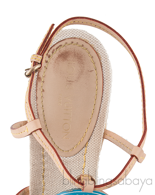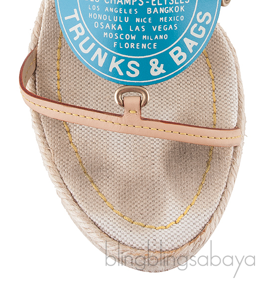 These Divine Trunks & Bags Espadrille Wedge from Louis Vuitton feature a blue Trunks & Bags logo with vachetta leather trim straps, an antique gold buckle fastening, canvas footbeds. an espadrille wedge for a comfortable fit and rubber sole.
