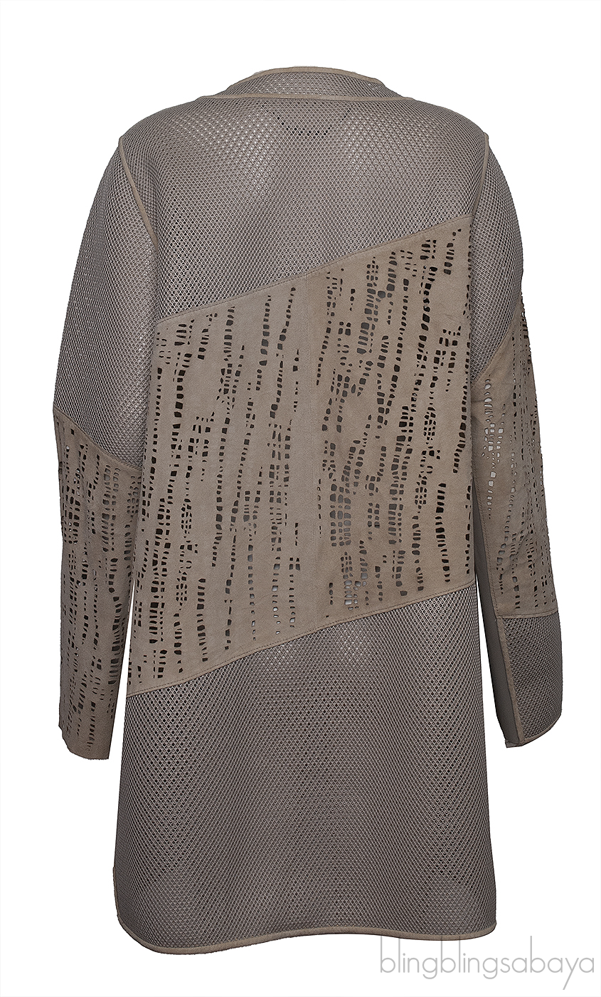 This Elie Tahari Beige Perforated Mesh Leather Cardigan is crafted from 100& lamb skin. 100% Polyester mesh fabric. This cardigan features open front, perforated and mesh detailing, long sleeves.