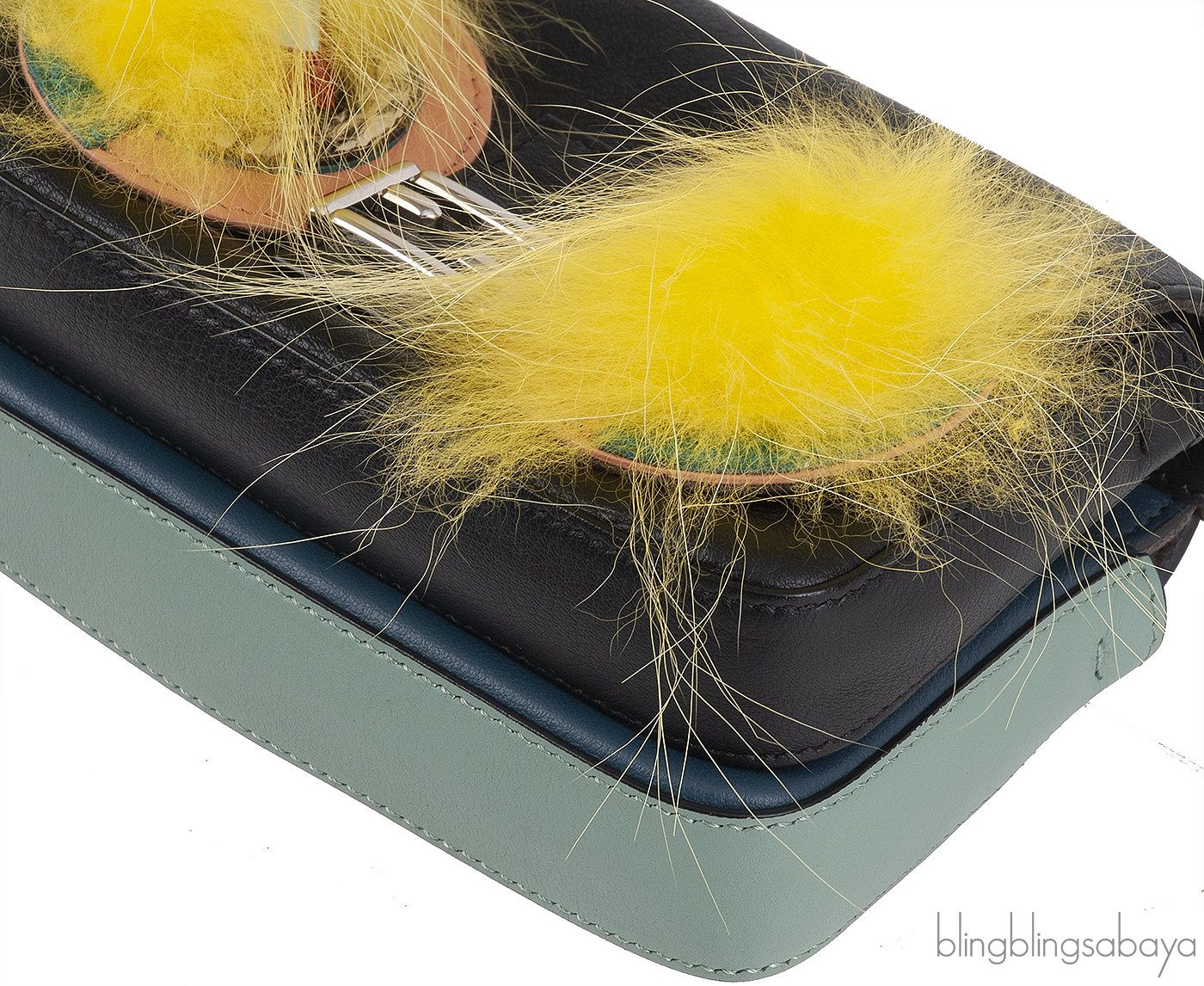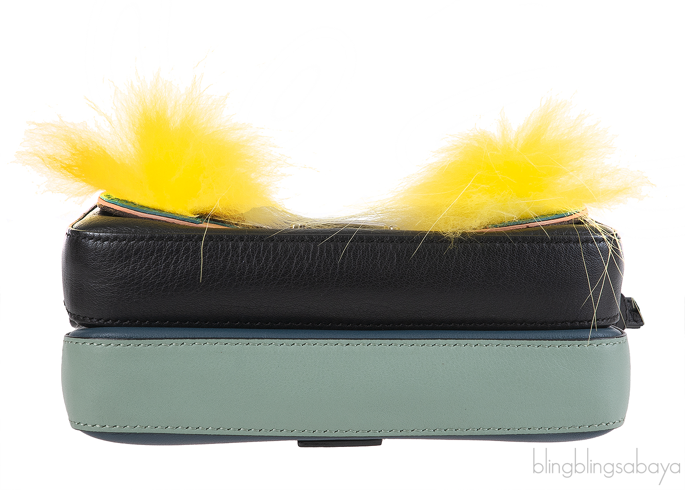 This Fendi Baguette Micro Double-Sided Monster Crossbody Bag is crafted from multicolor nappa leather accented with palladium hardware. This cute bag features a monster motif with flap magnetic closure with dyed yellow fur lashes, snakeskin leather around the eyes and signature FF logo hardware on flap. Interior is fully lined with suede with two major compartment and two card holders on one side and has wall pocket and roomy interior on the other side. This comes with spike accent top handle and long detachable chain and leather shoulder strap.