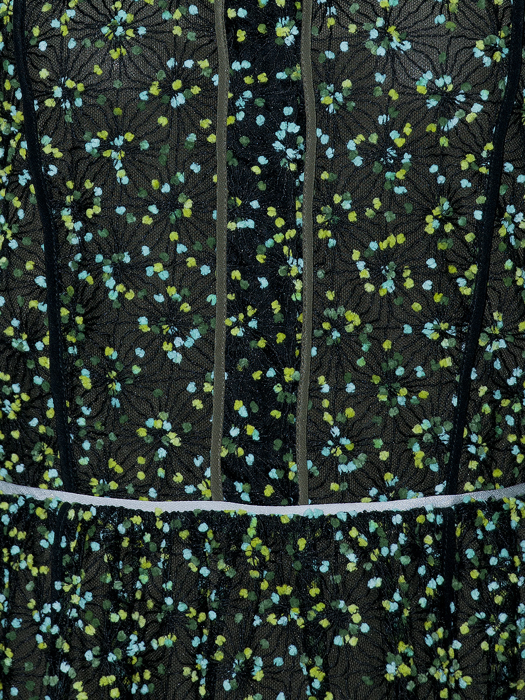 This Fendi Green Embellished Long Sleeve Mini Dress crafted in 20% Polyamide and 50% Acrylic and 100% Silk fabric featuring a floral embroidered dress with collar, button fastening at front, see-through embroidered long sleeves and mini length. Fully Lined.
