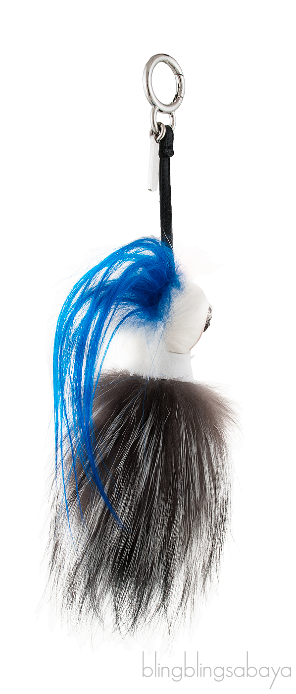 This hottest "it accessory" Limited Edition Mini Karlito Bag Charm from Fendi is beautifully crafted in the pink tuft and blue edge, black tie in nappa leather and white shirt collar with white and grey fox fur body, black calfskin leather laces with palladium finish spring clip and Tag. Made in Italy!