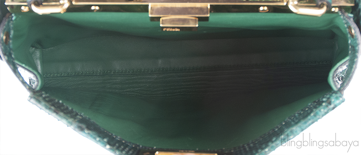 This exquisite Peek-a-boo has a gold bolt detail divider, interior is lined with decadent coordinating soft nappa leather. Interior zip pocket and gold logo plate inside. Side bands along top with double F engraved button studs disconnect to expand the bag.