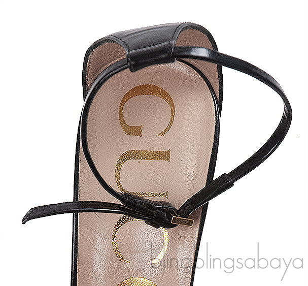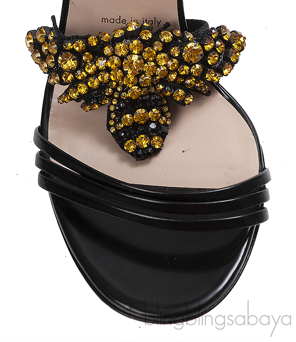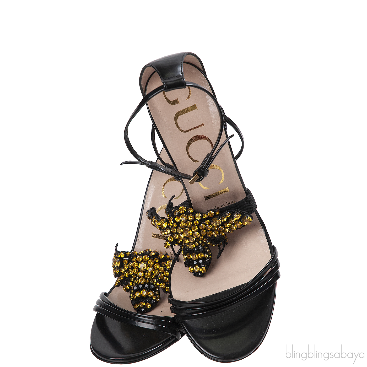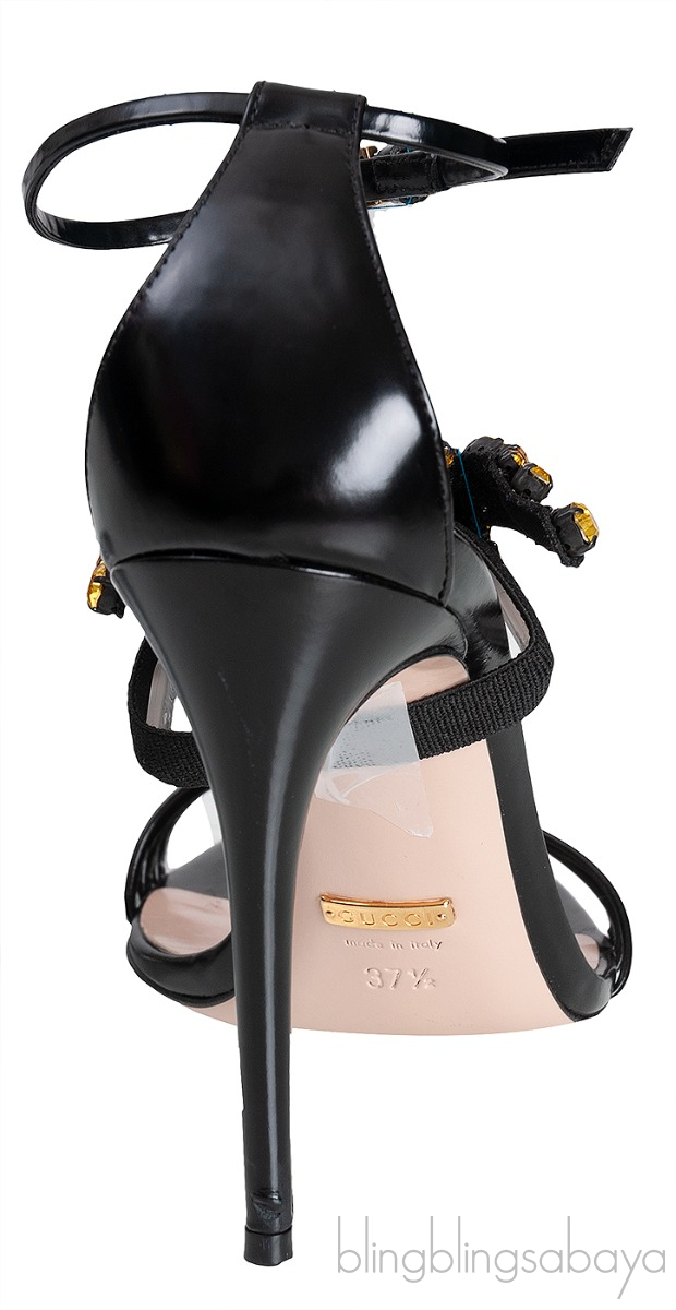 This Black Bee Embellished Crystal Sandals from Gucci is crafted from black patent leather and nude leather lining. These sandals features a three leather straps at vamp, peep almond tow, slingback with gold fastening, stiletto heels measuring 100 mm high, leather lined sole, optional black elastic strap with embellished crystal bee.