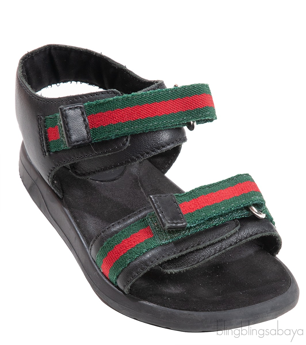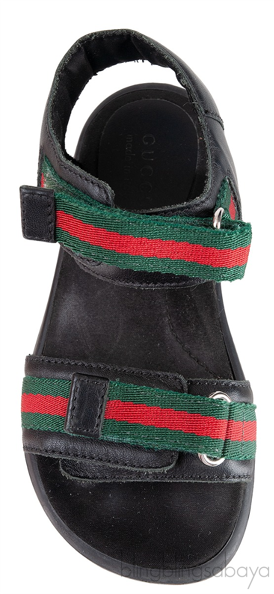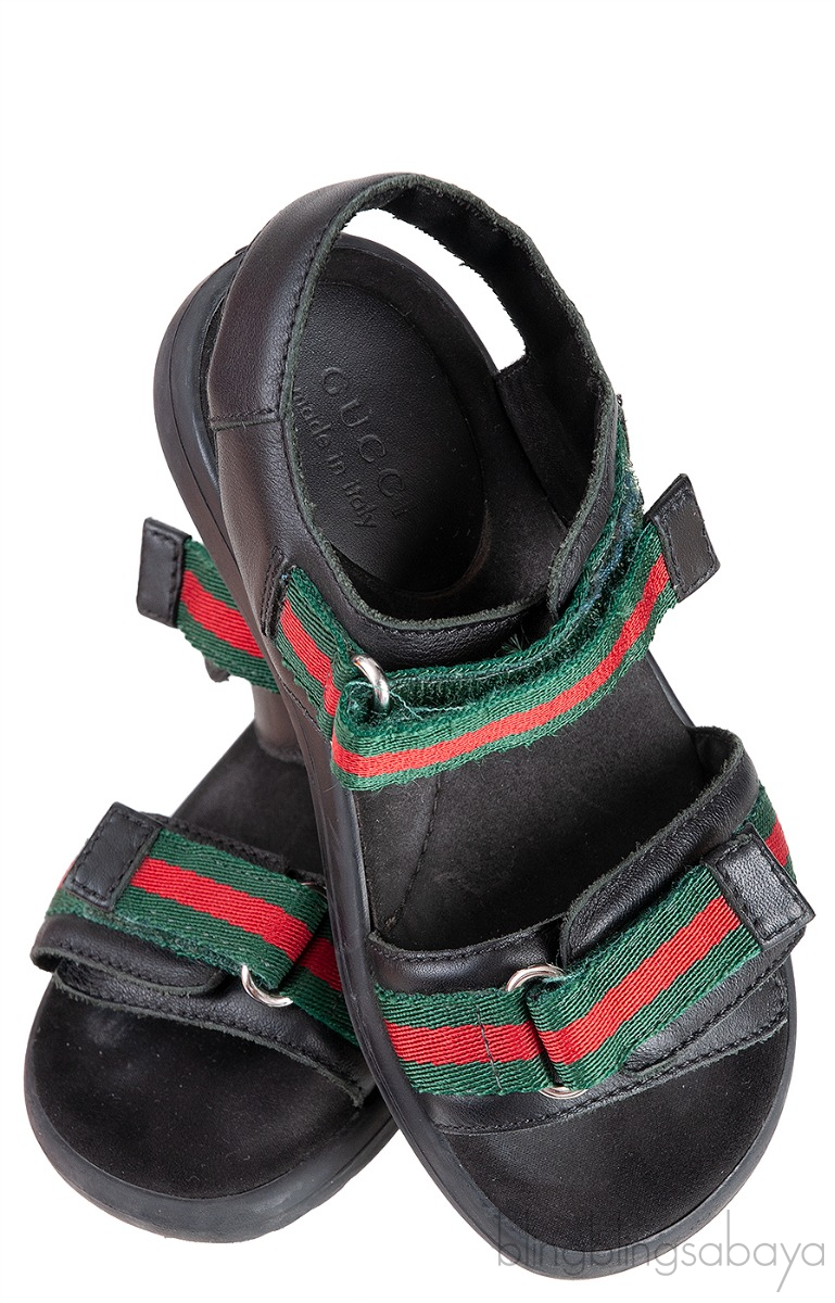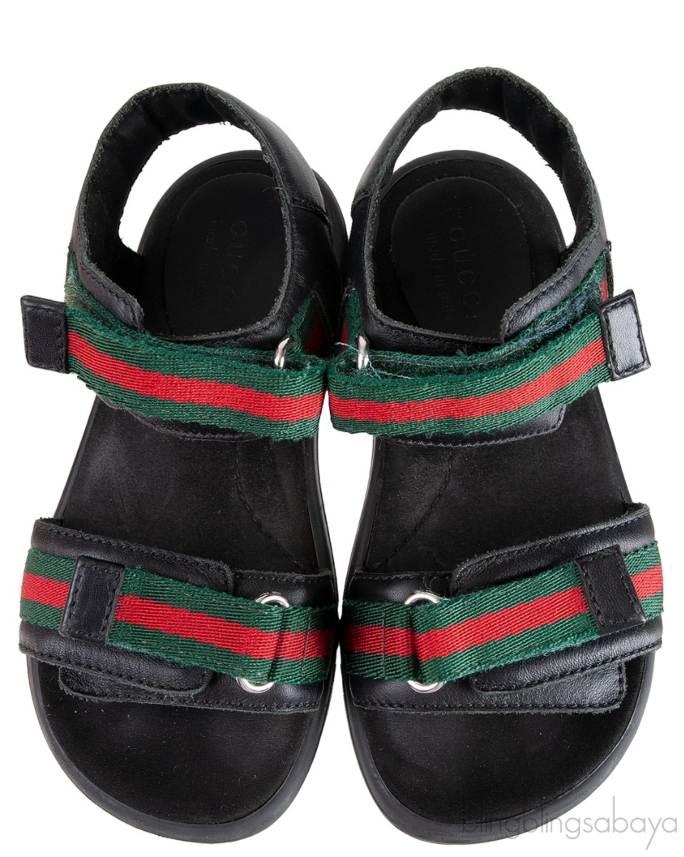 These Black Strappy Web Kids Sandals from Gucci are crafted from black leather and fabric upper. These sandals features a strappy design with velcro fastening, silver buckle, leather insole and black rubber sole.