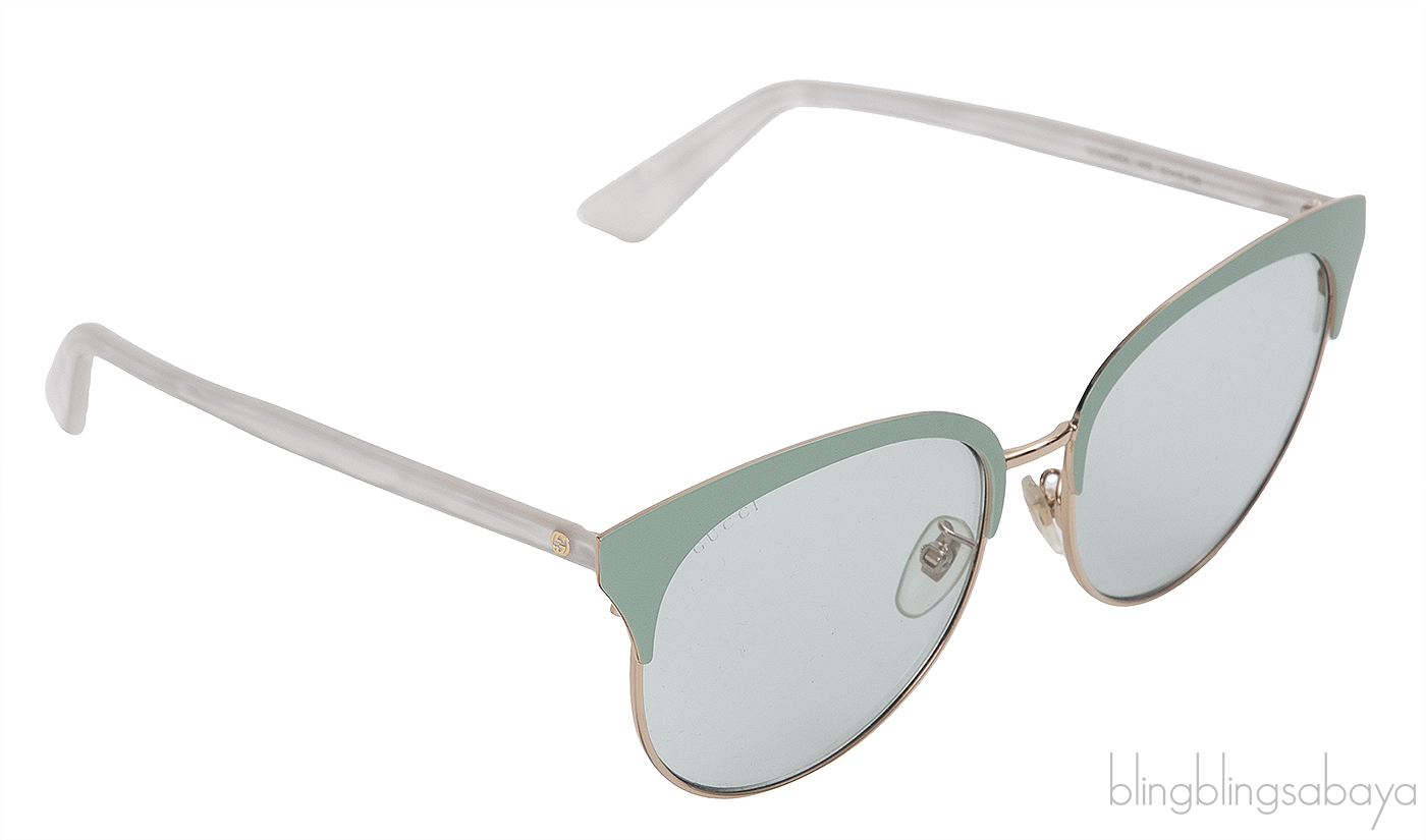 This GG0246SA 003 Sunglasses from Gucci features a rounded frame in gold and green with light green lenses, pearl arm with gold bee engraving, nose pads.