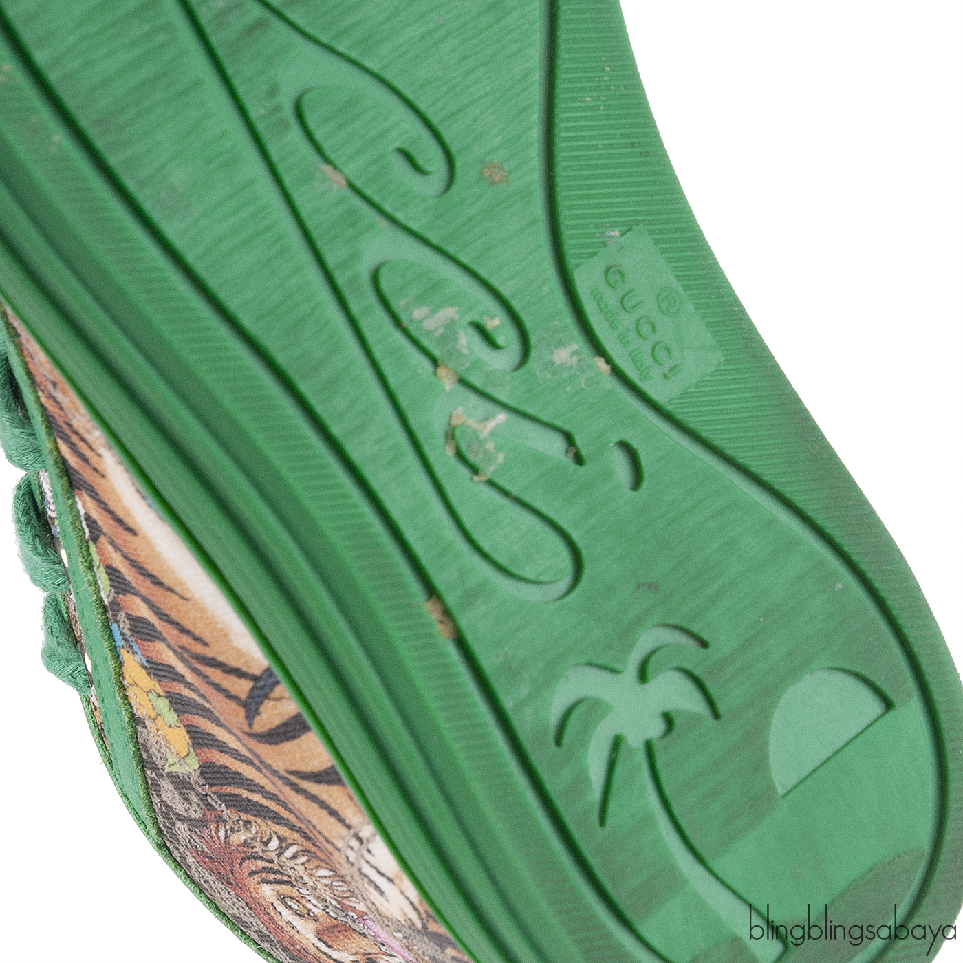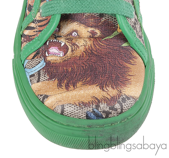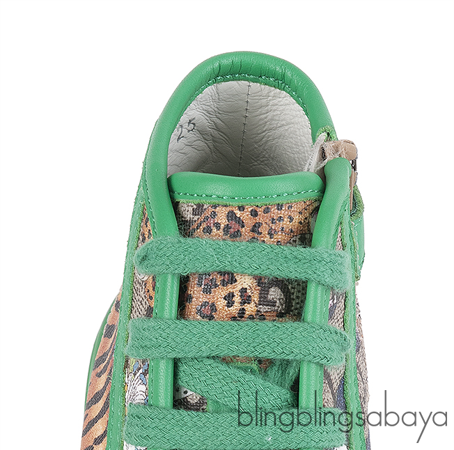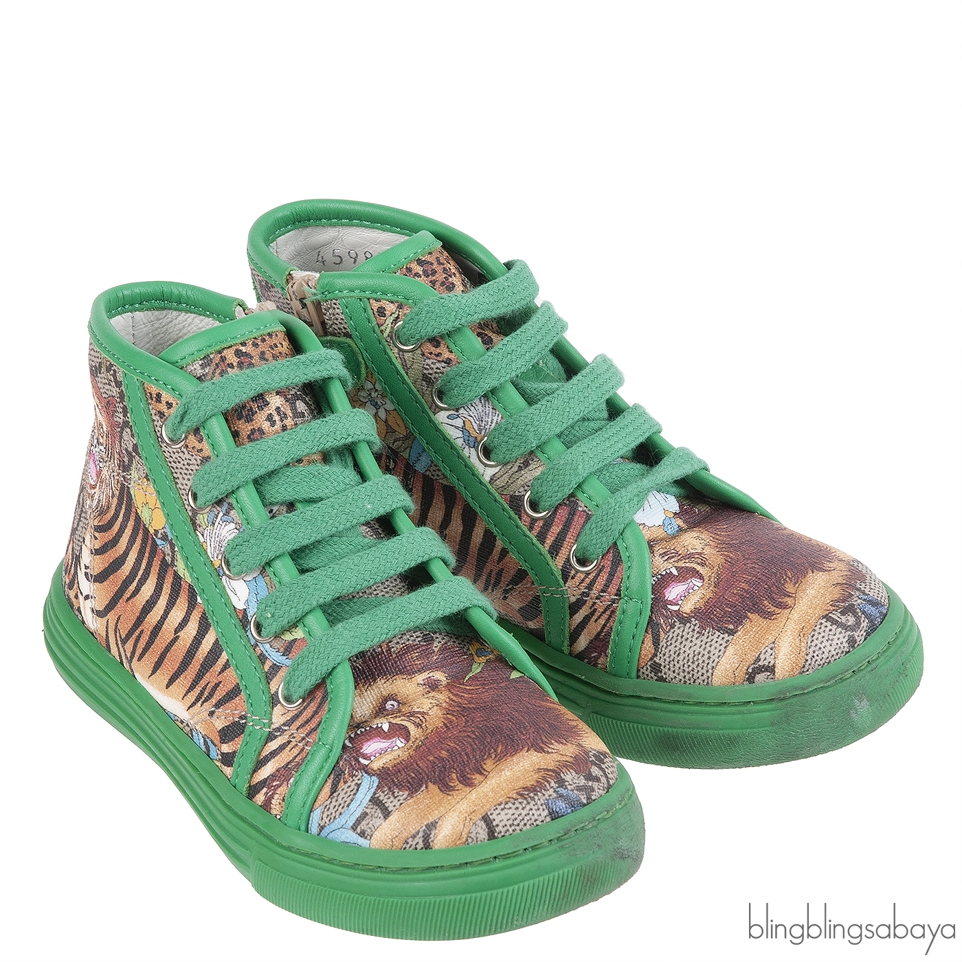 This pair of Gucci Green Safari Kids Sneakers is crafted from animal print safari motif upper with white leather lining. These sneakers features a contrasting green shoes laces, zip and velcro fastening on the side, leather insole and green rubber sole.