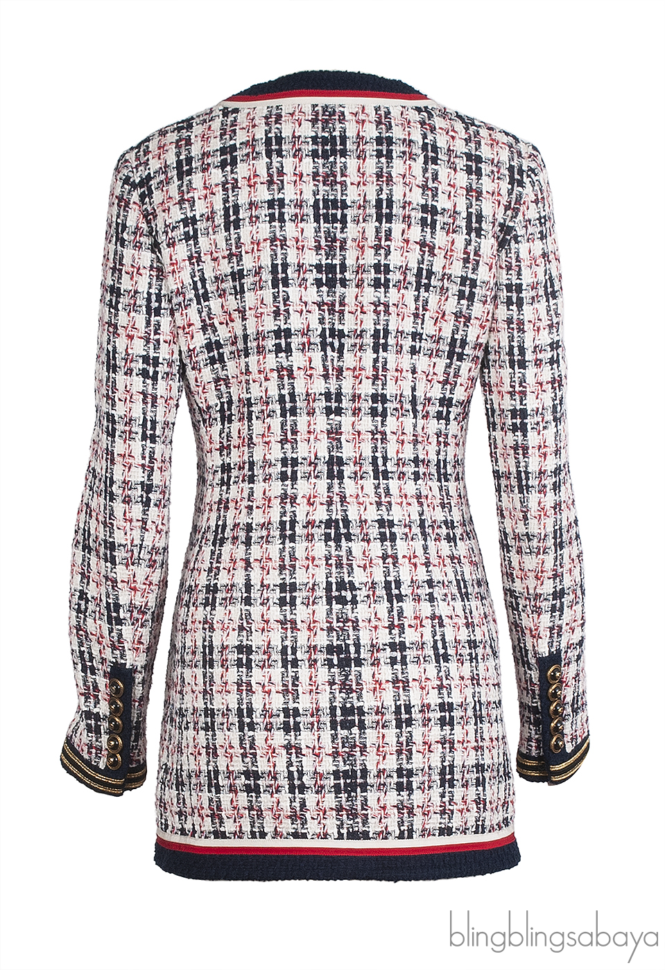 This Gucci tweed blazer is crafted from multicolored tweed cotton blend fabric with floral printed off-white fabric lining. This jacket features a V-neckline, front GG gold button closure, and long sleeves with buttoned cuffs. It includes welt pockets , Gucci Web stripe trim, along with a GUCCI logo patch.