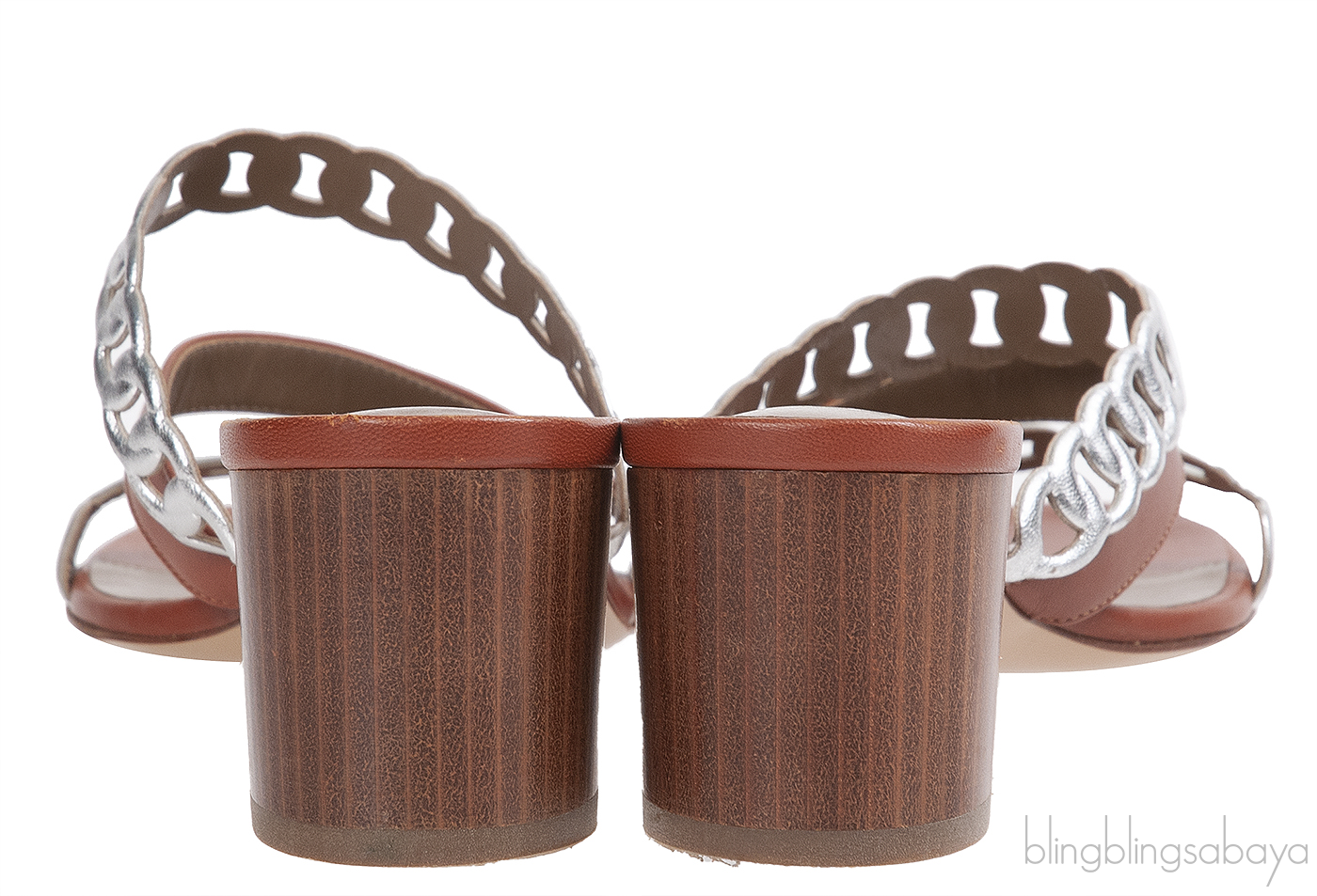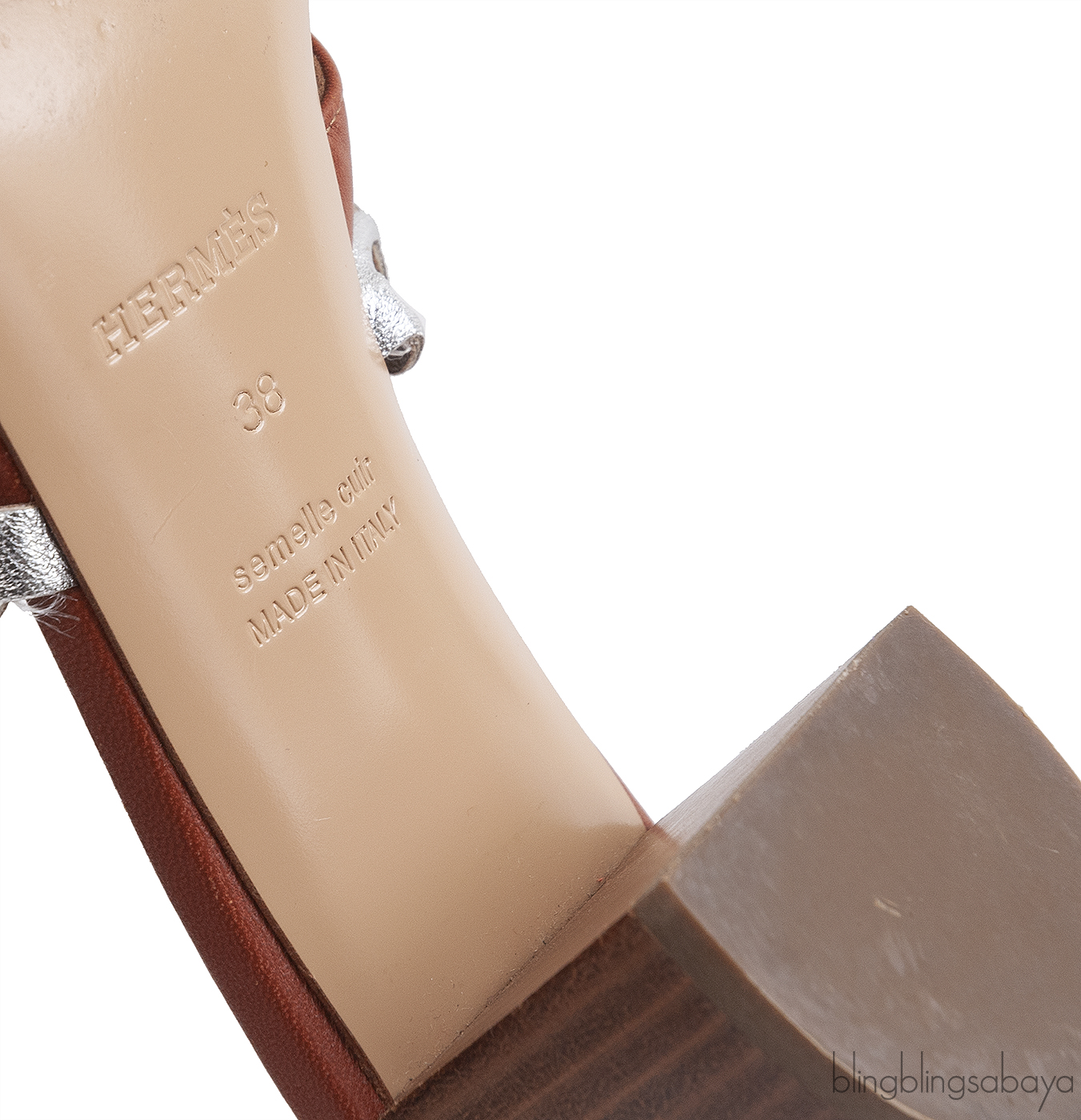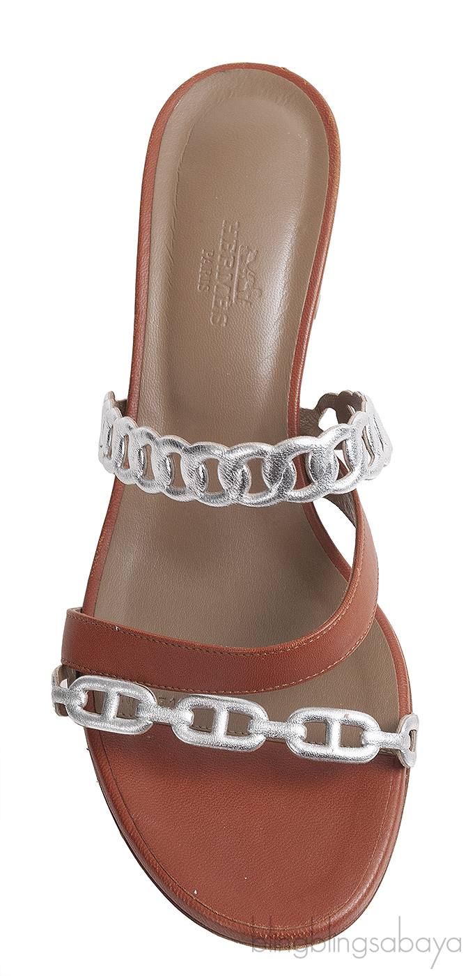 These Brown Ajaccio Sandals from Hermes are crafted from leather featuring a silver chain d\'ancre and brown strap, peep almond toe, leather lined insole and sole and a chunky 2.25-inch heel.