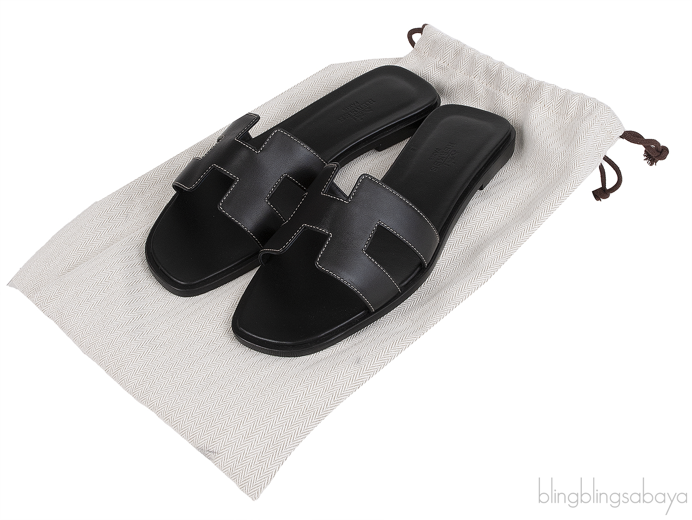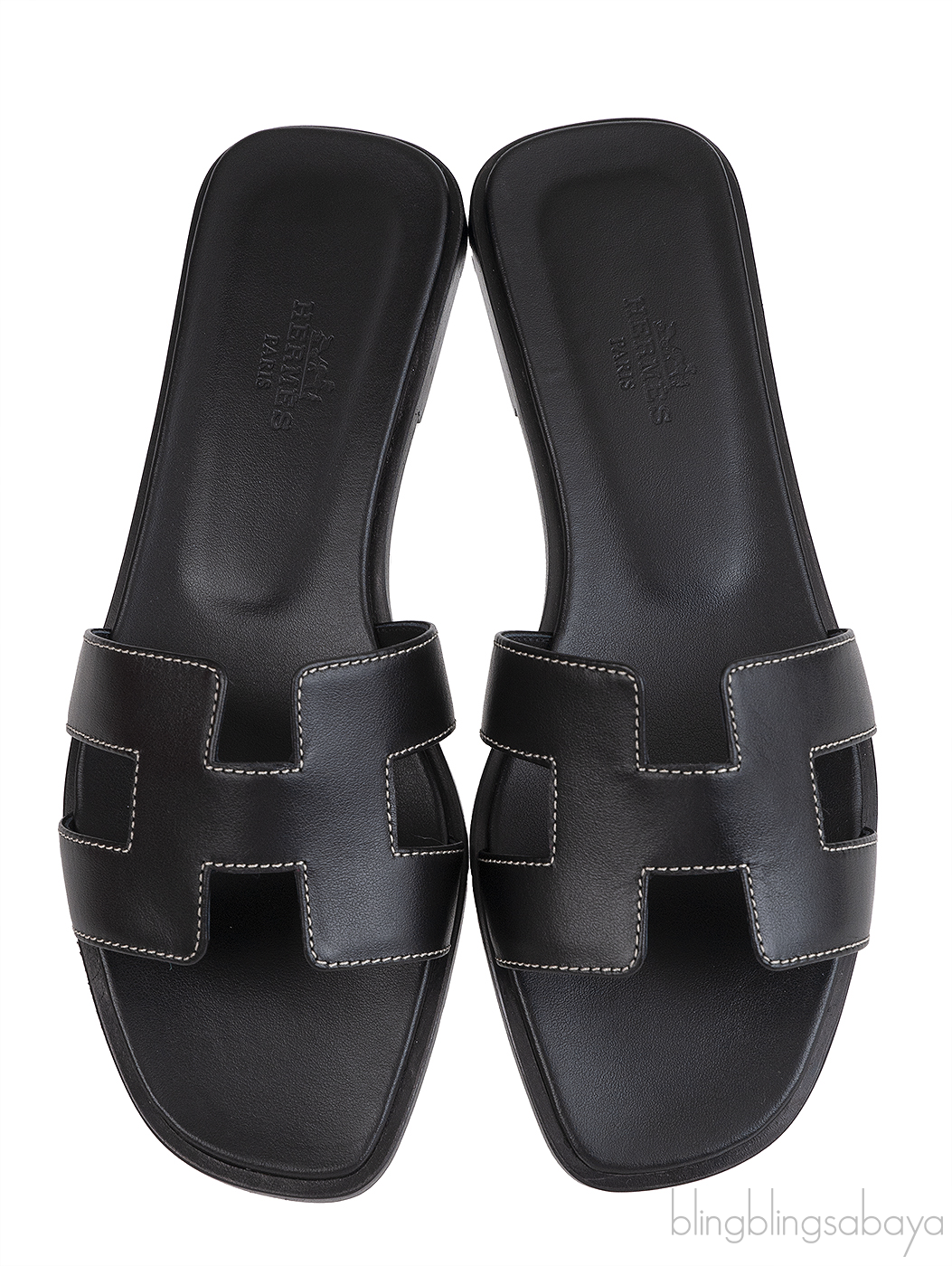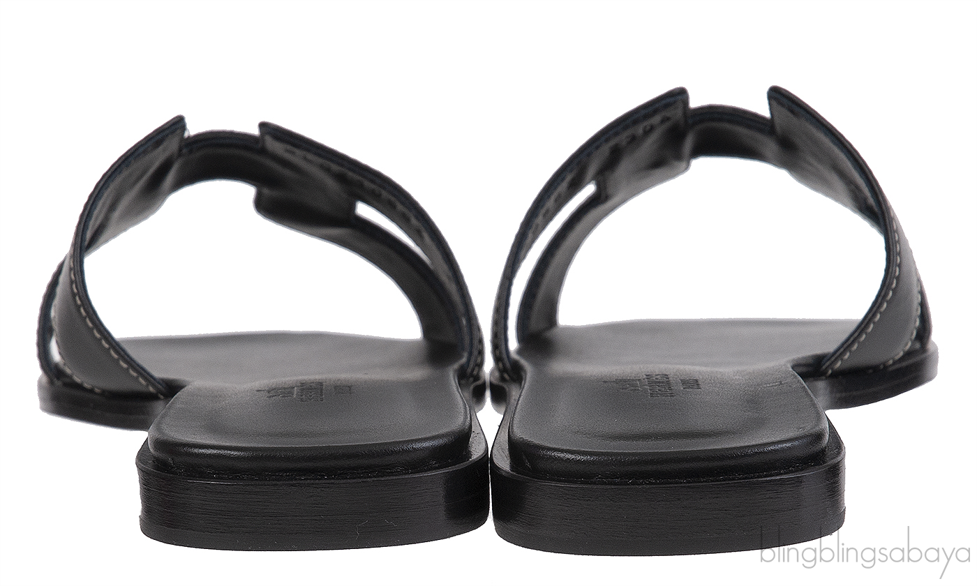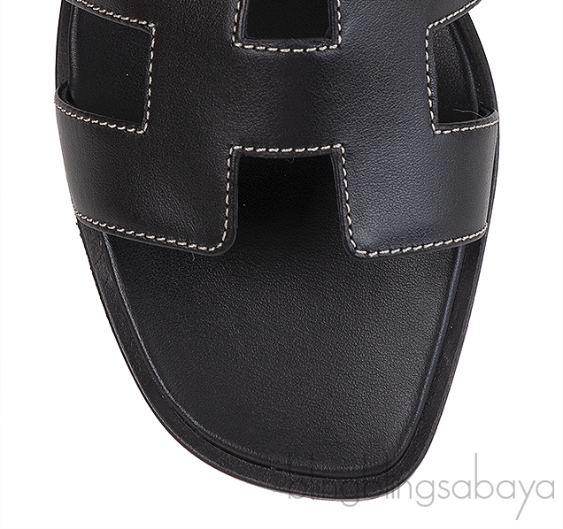 This pair of Hermes Oran Black Box Leather Sandals is crafted in Box Leather with contrasting white stitching. The Hermes "H" shaped Leather design adds signature detail at the vamp. Leather lining and cushioned insole with the Hermes named embossed on heel pad. This sandal is easier to try on or pull-off, it is also soft so it is comfortable to wear and easy to walk in!
