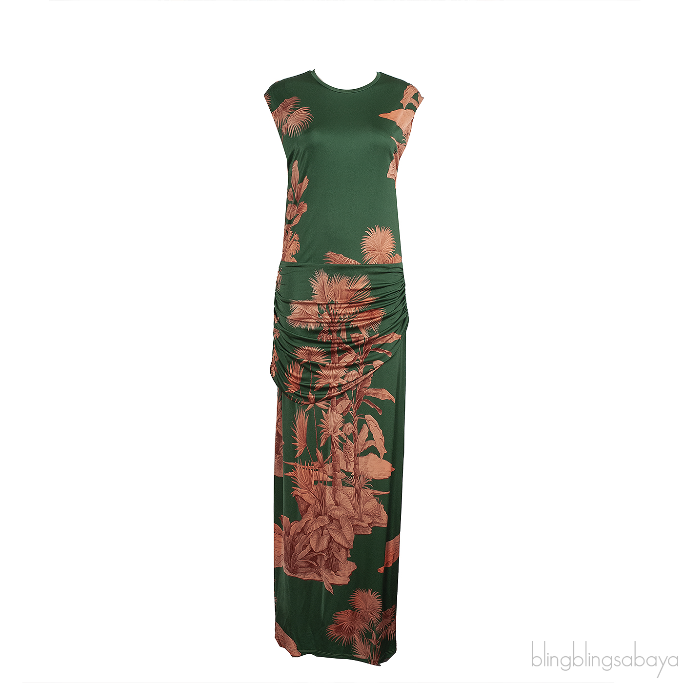 This Johanna Ortiz Finding The Way Floral Maxi Dress is crafted from 96% viscose, 4% elastane. This midweight jersey dress in green features a round neckline, sleeveless, ruched fabric at waist, back button closure, partially lined and ankle length.
