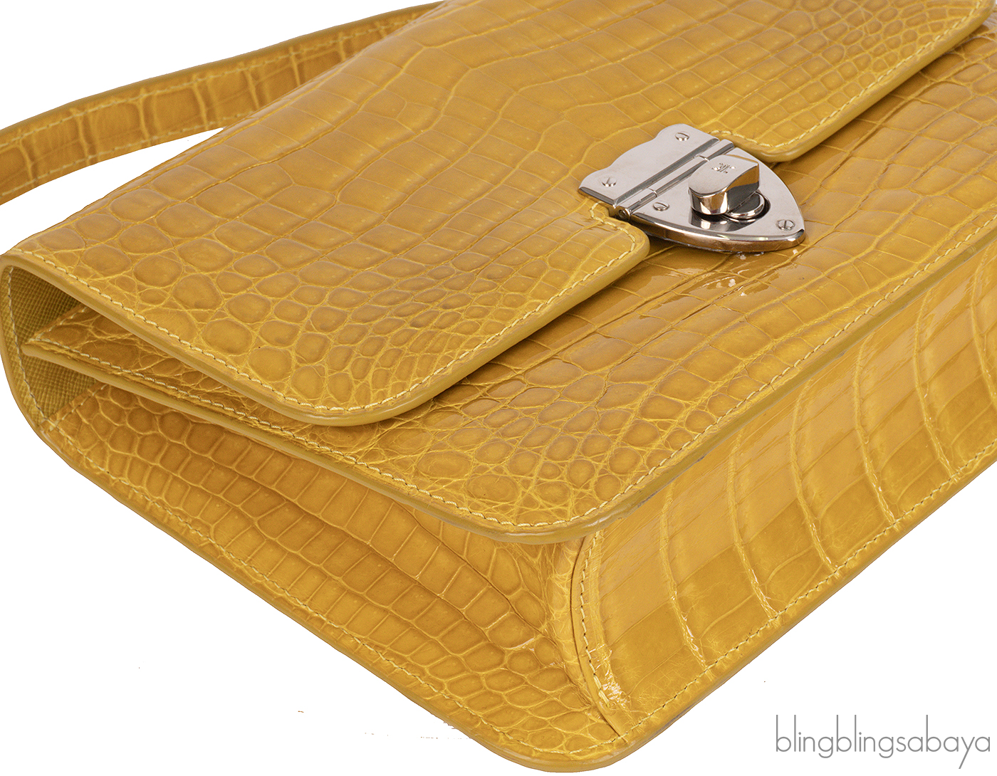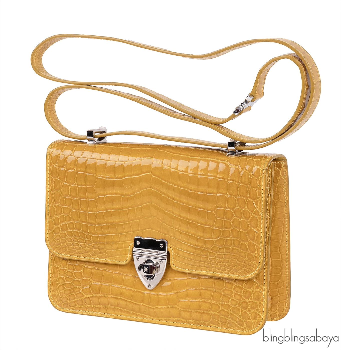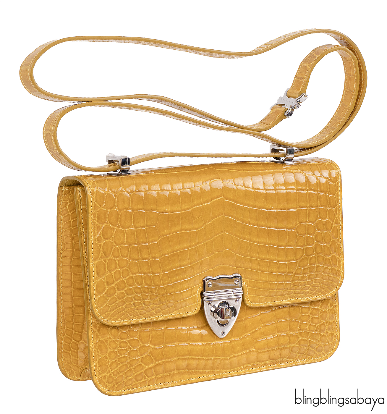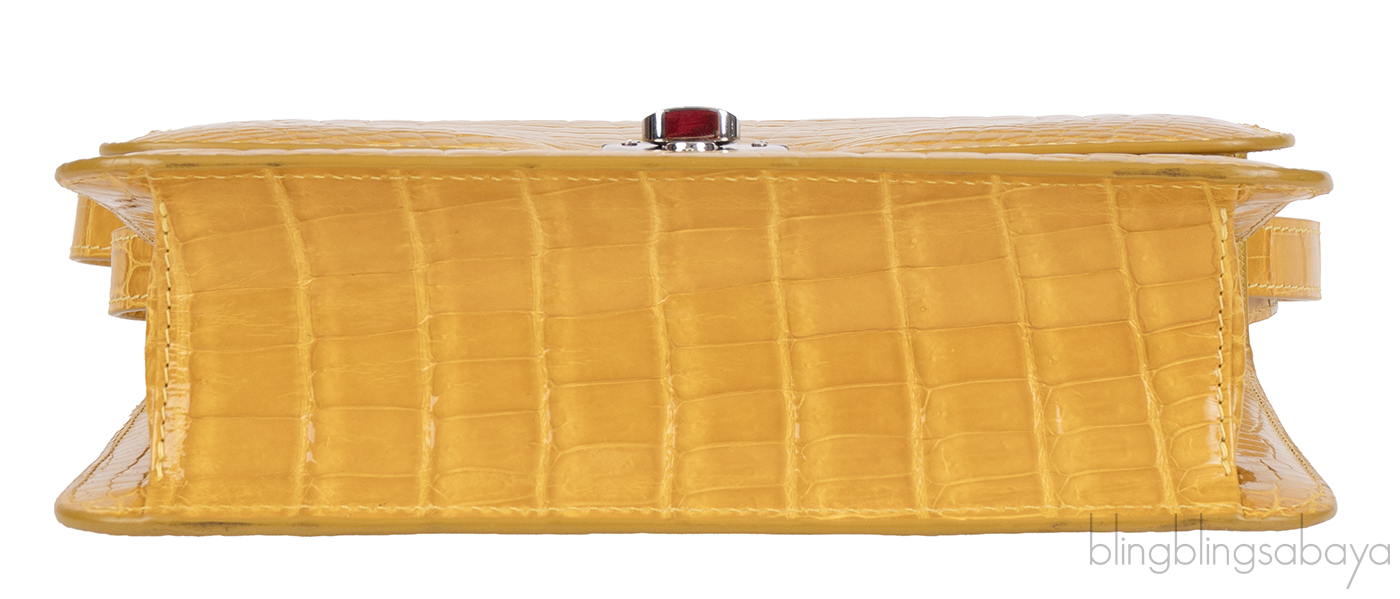 This Mustard City Cruiser Sling Bag from Kwanpen is beautifully crafted from a precious exotic crocodile leather in patent mustard accented with palladium hardware. This petite City Cruiser Sling Bag is the ultimate day to evening bag featuring a hard, sleek and structured lines meeting subtle curves with long leather shoulder strap.