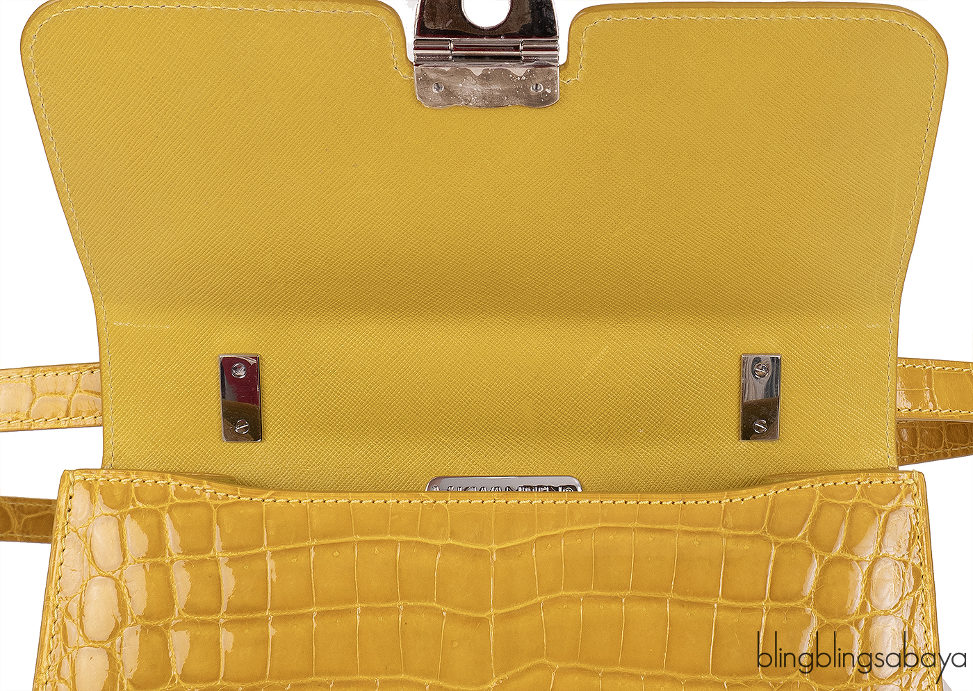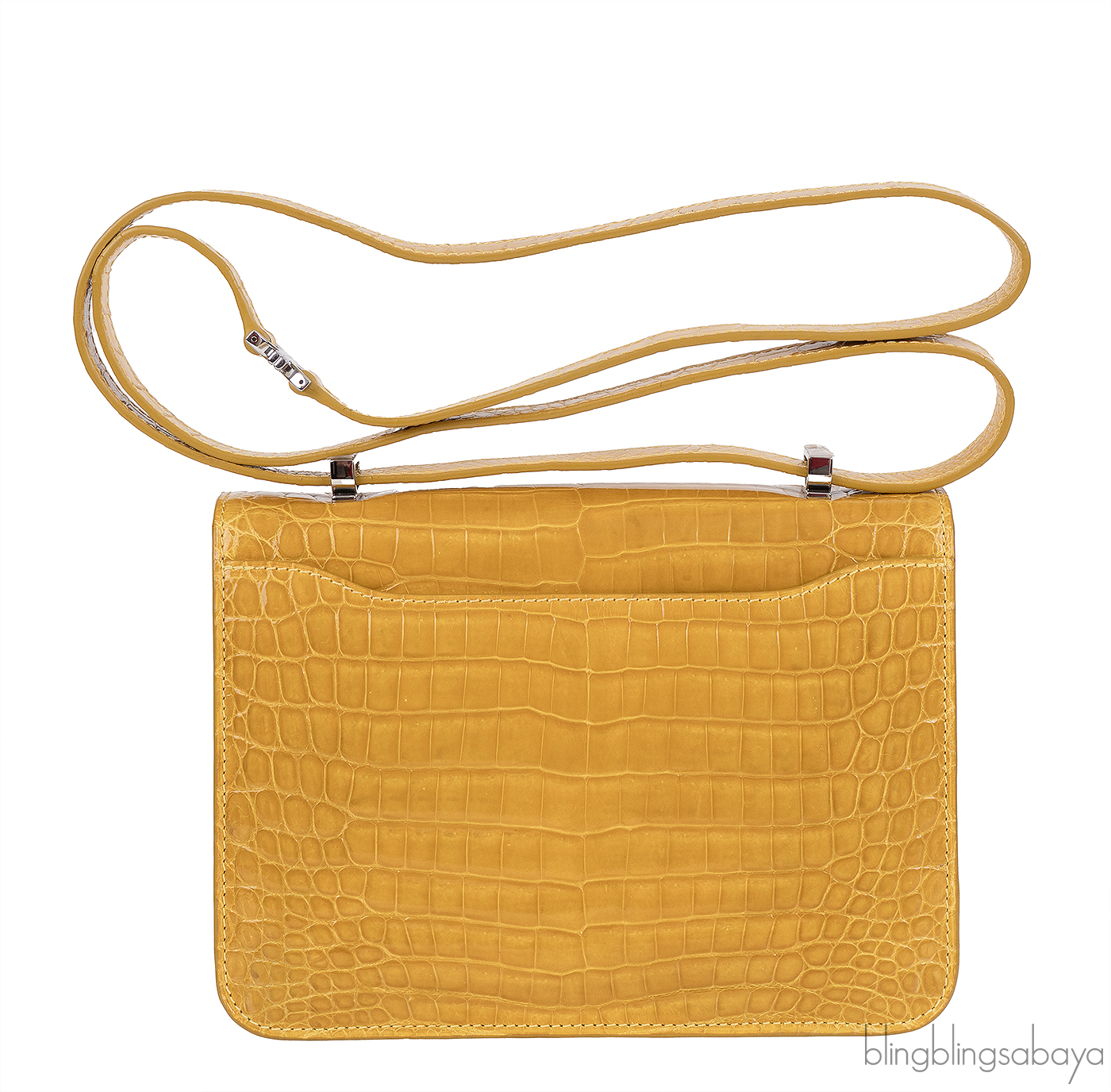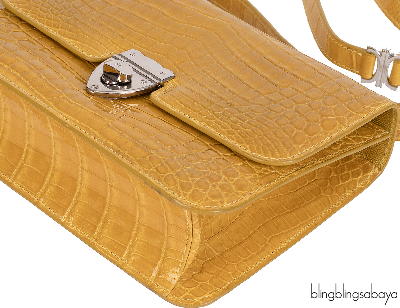 This Mustard City Cruiser Sling Bag from Kwanpen is beautifully crafted from a precious exotic crocodile leather in patent mustard accented with palladium hardware. This petite City Cruiser Sling Bag is the ultimate day to evening bag featuring a hard, sleek and structured lines meeting subtle curves with long leather shoulder strap.