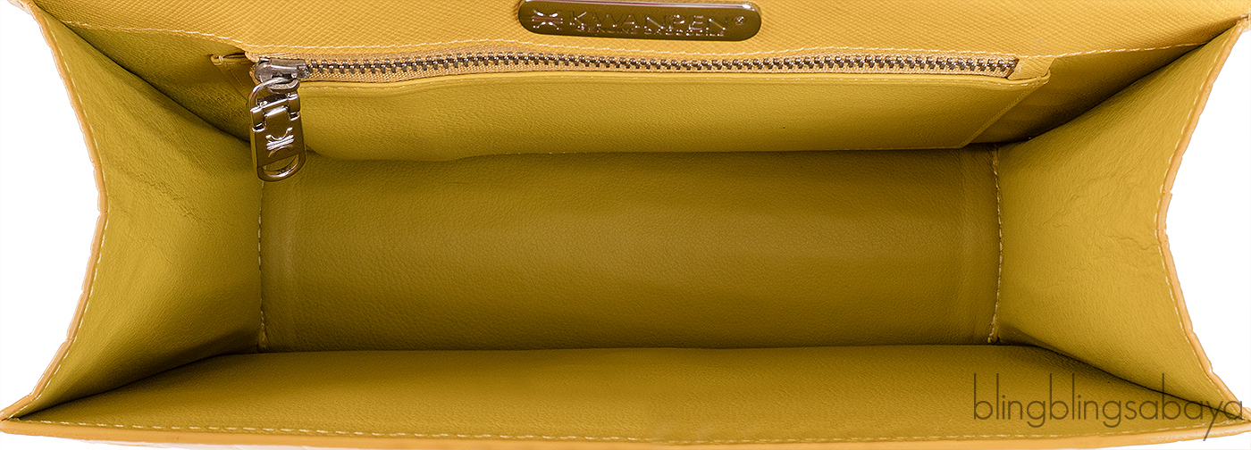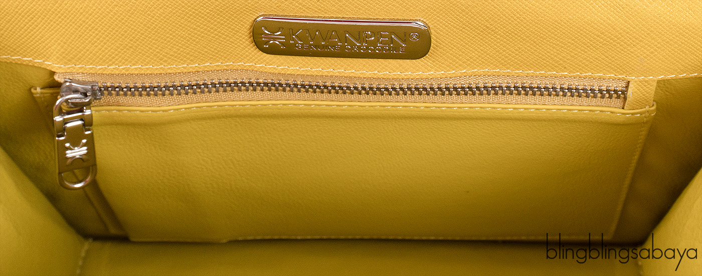 This bag has a flap cover with a signature turn-lock closure, interior is fully lined with coordinating leather and has one large compartment; one interior zip pocket and one interior metal plate engraved with KWANPEN signature.