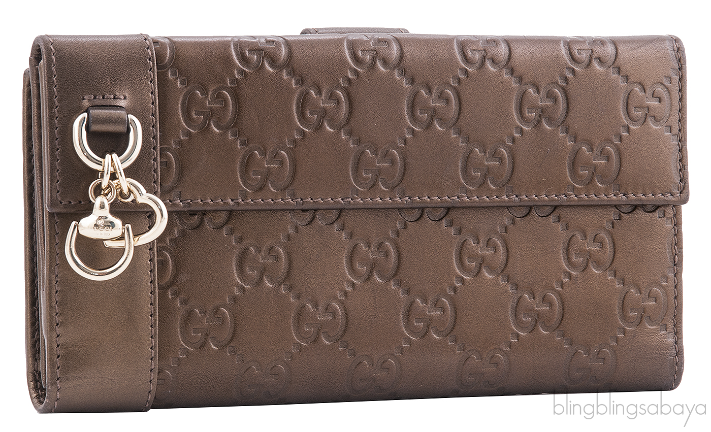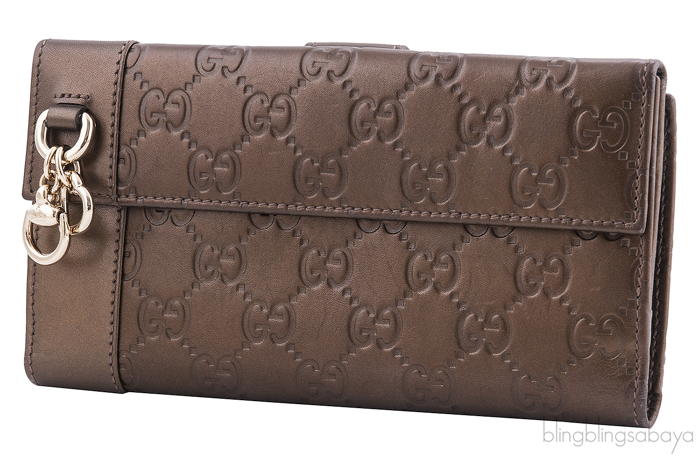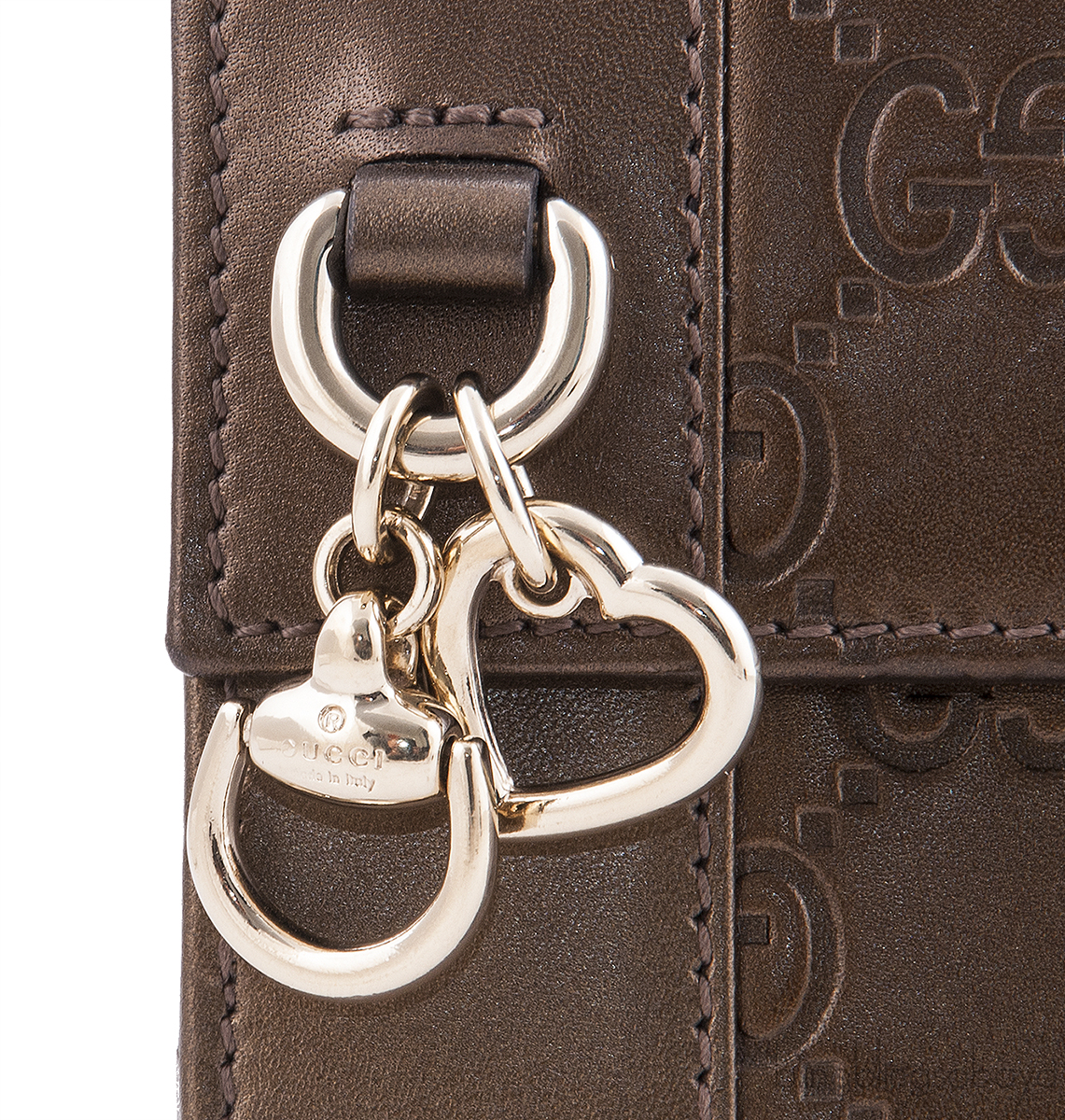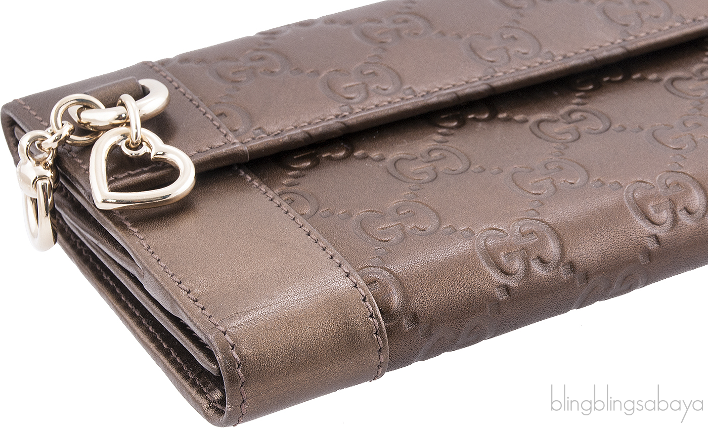 This Long Wallet Heart Charm from Gucci is crafted in brown metalic GG leather pattern accented with the golden hardware. This long wallet features a front flap with horsebit and heart charm whimsically dangling at front . Interior is lined with leather with several compartment for receipt, notes and bills and has eight credit card slots inside.