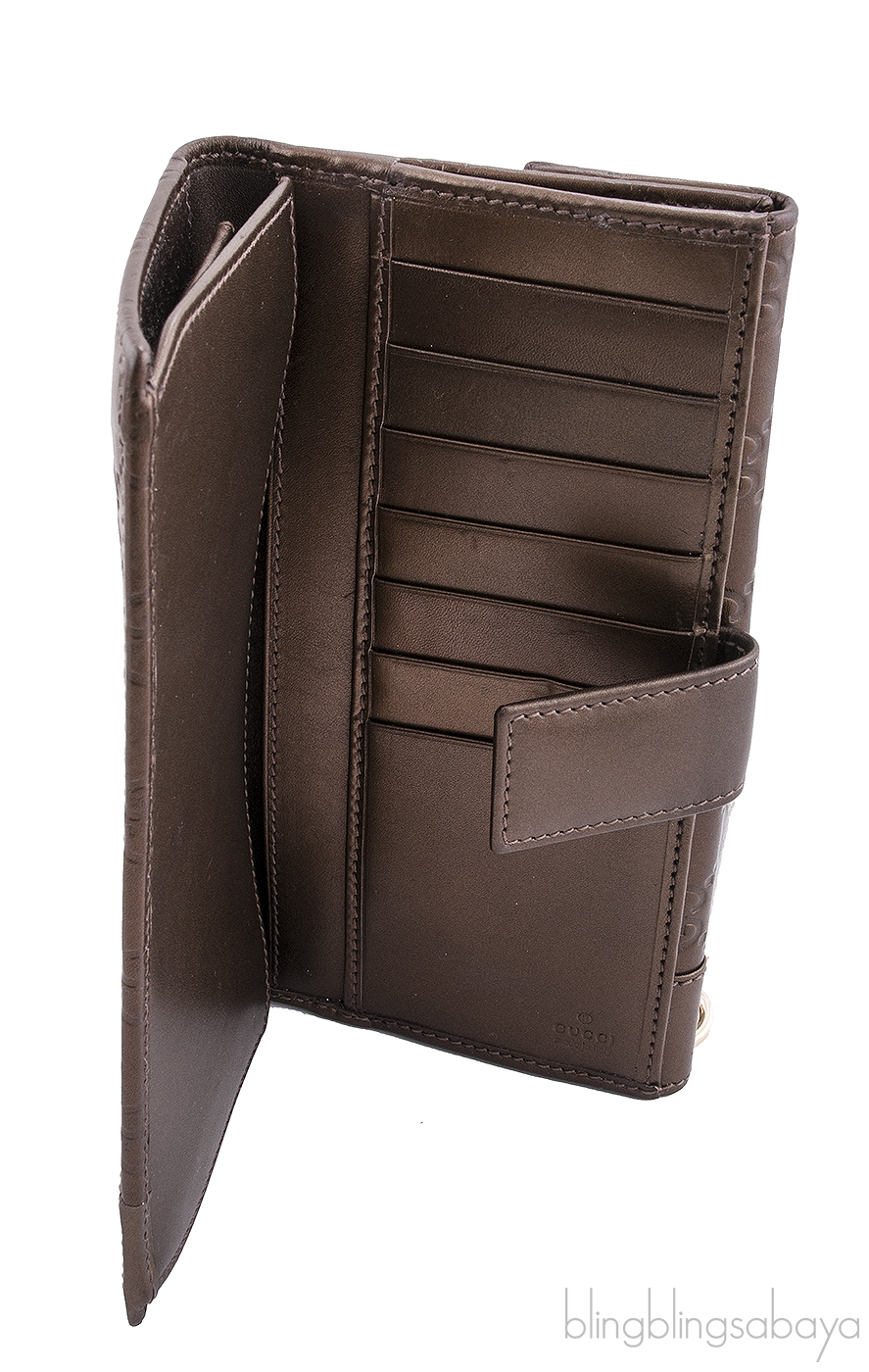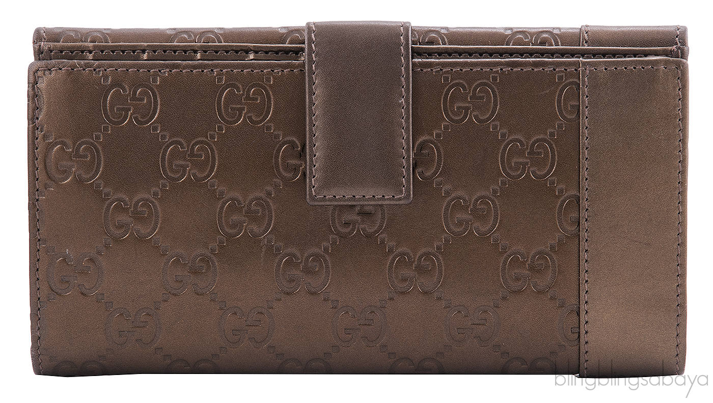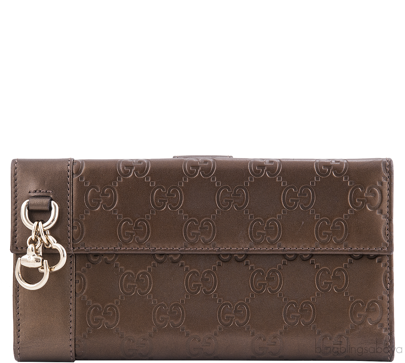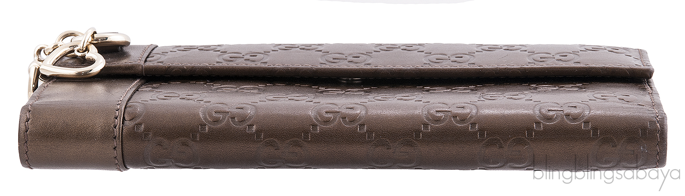 This Long Wallet Heart Charm from Gucci is crafted in brown metalic GG leather pattern accented with the golden hardware. This long wallet features a front flap with horsebit and heart charm whimsically dangling at front . Interior is lined with leather with several compartment for receipt, notes and bills and has eight credit card slots inside.