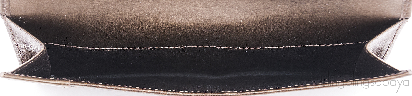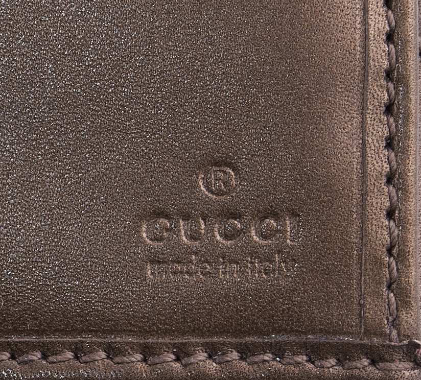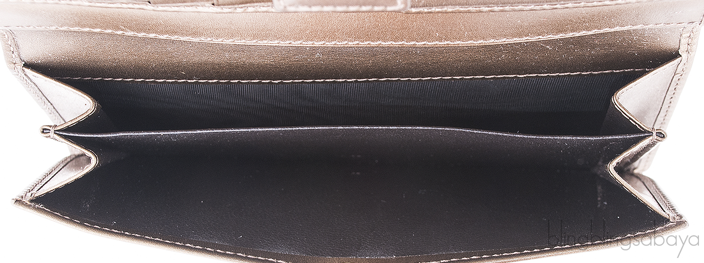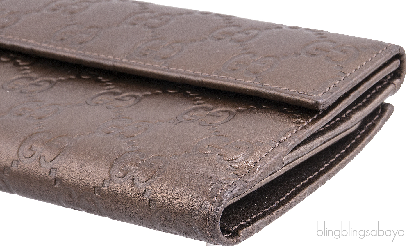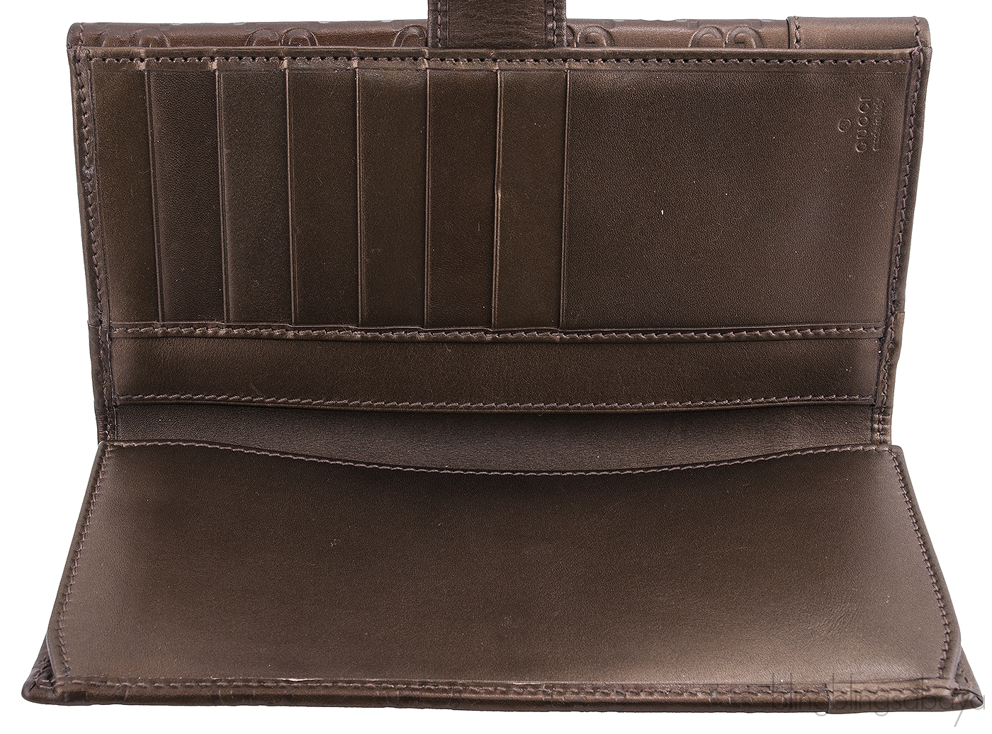 This Long Wallet Heart Charm from Gucci is crafted in brown metalic GG leather pattern accented with the golden hardware. This long wallet features a front flap with horsebit and heart charm whimsically dangling at front . Interior is lined with leather with several compartment for receipt, notes and bills and has eight credit card slots inside.