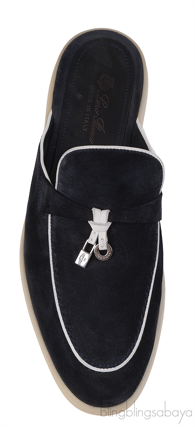 This pair Loro Piana Charm Walk Babouche Suede Black Mules expertly crafted from unlined suede with a light water-repellent and stain-resistant finish, it offers both elegance and practicality. The design is enhanced by a contrasting white leather piping and signature band adorned with Loro Piana My Charms , while the leather insole and flexible rubber sole ensure exceptional comfort and ease of wear.